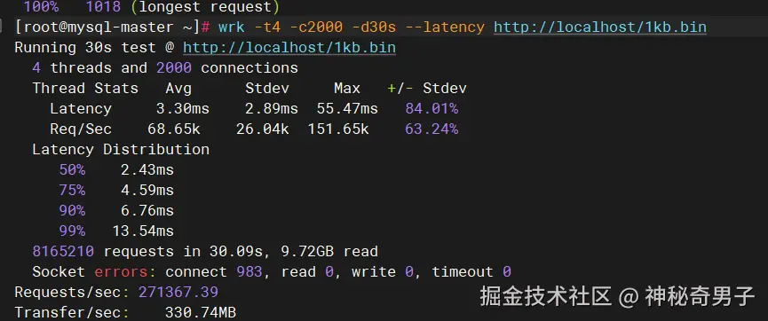 wrk -t4 -c2000 -d30s --latency http://localhost/1kb.bin