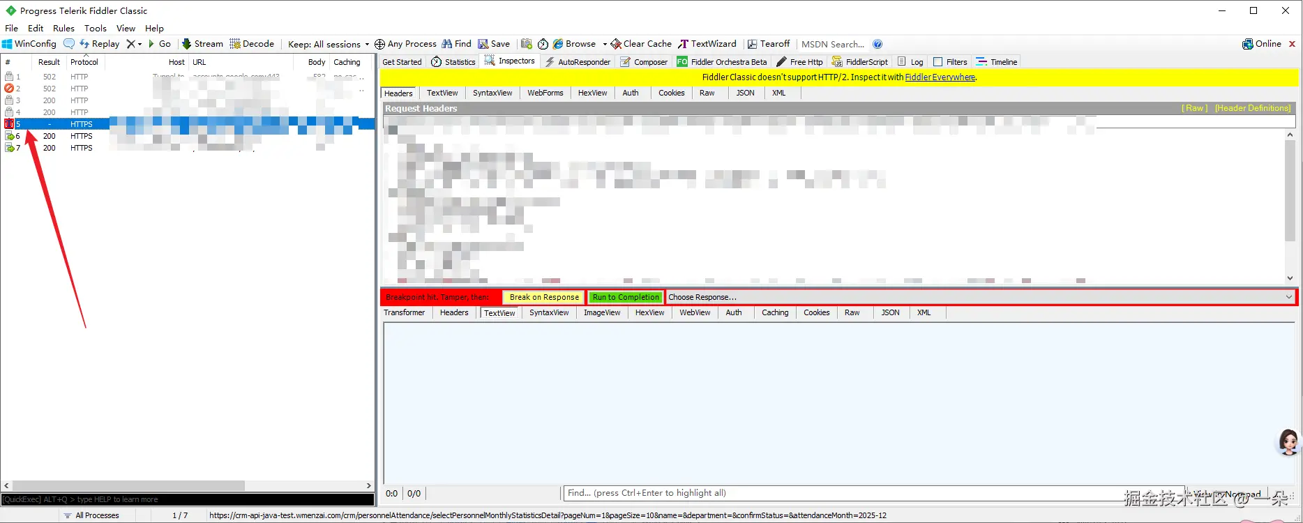 当断点生效后,浏览器会显示 "加载中...",Fiddler 界面会显示被拦截的请求: