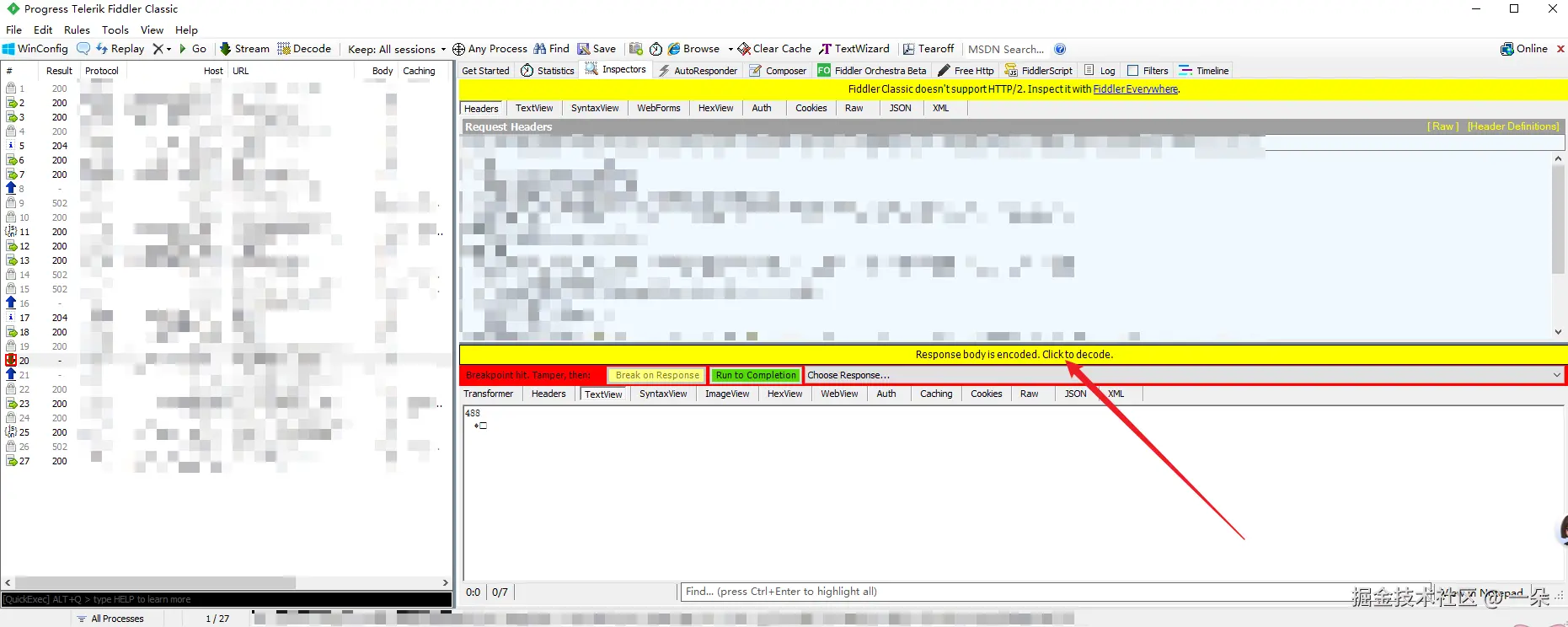 - 在 Fiddler 右侧 Inspectors → Response 面板的顶部,找到一个 Decode 按钮