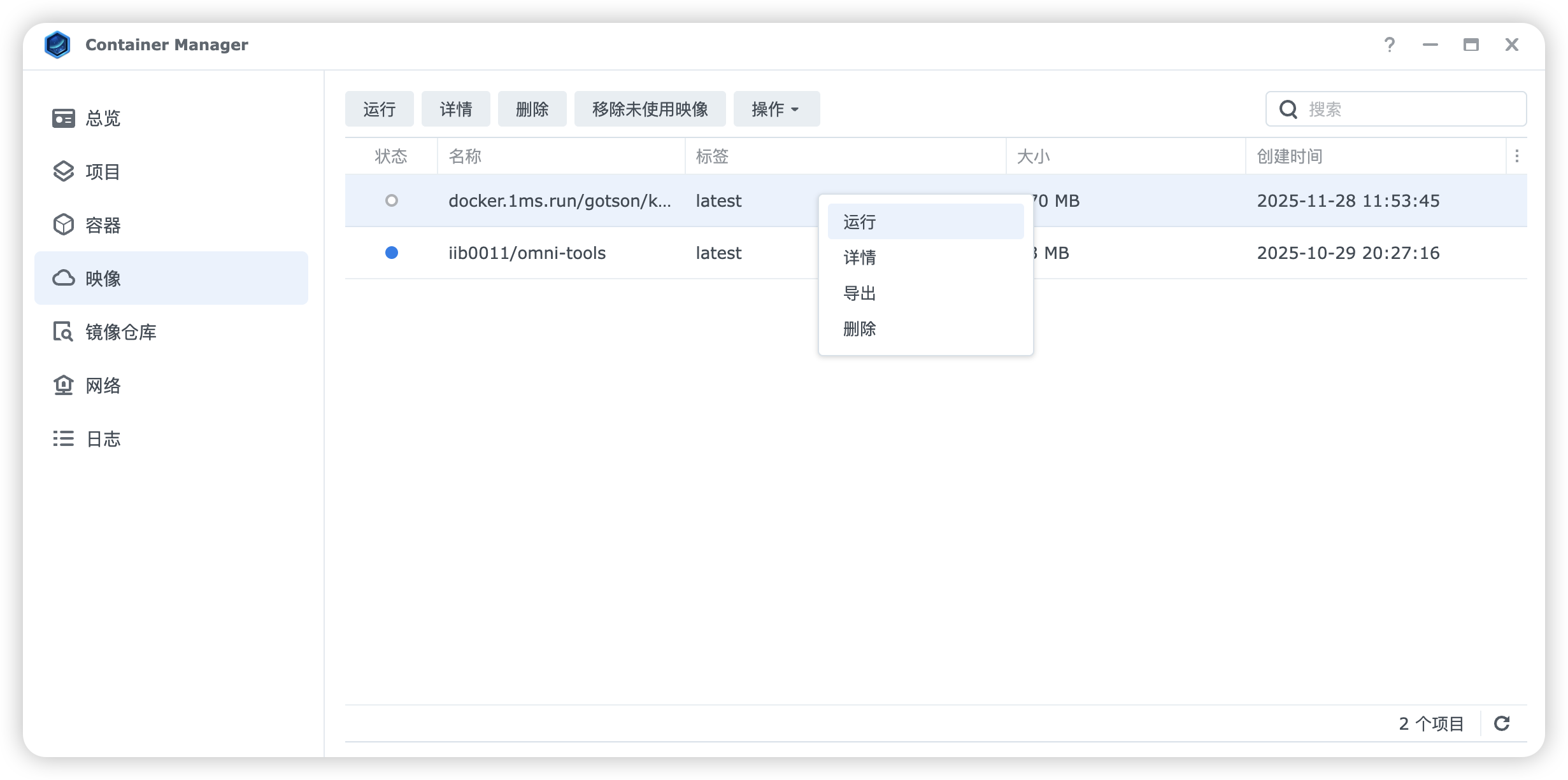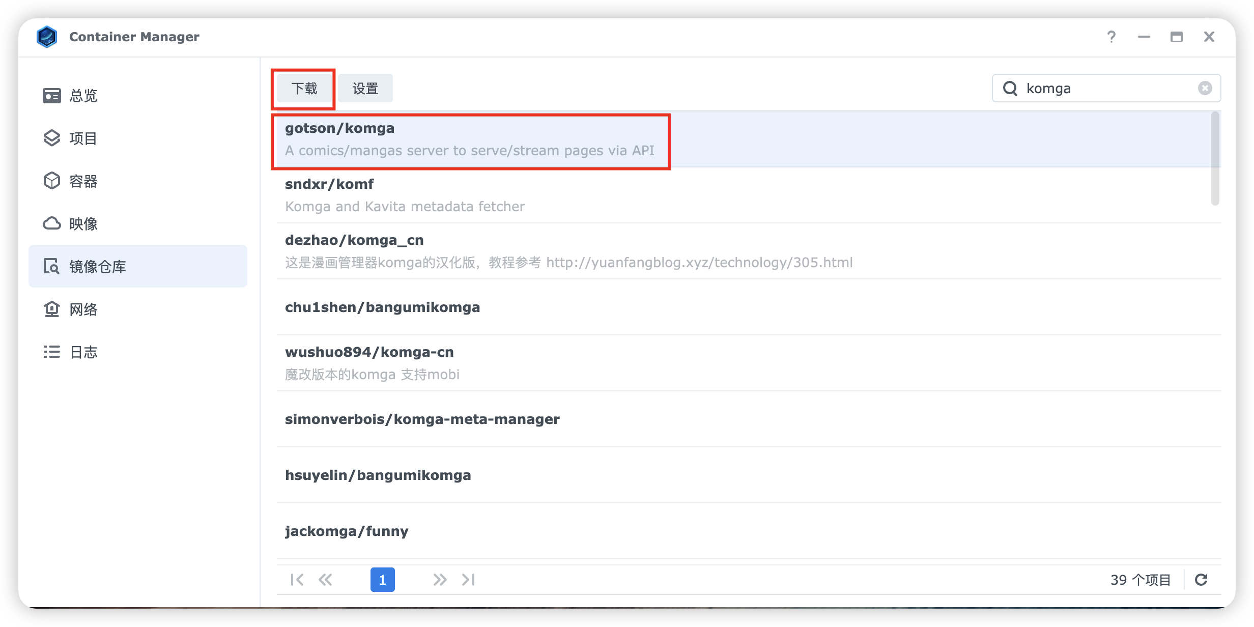 创建文件夹的操作完成后,打开 Container Manager,在“镜像仓库”里搜索“komga”,第一个 gotson/komga 就是我们的要找的工具。选中它,再点击下载。版本我选了 latest。