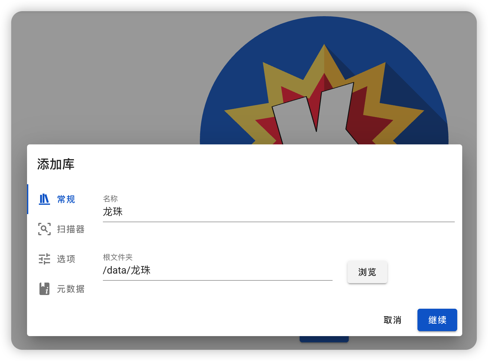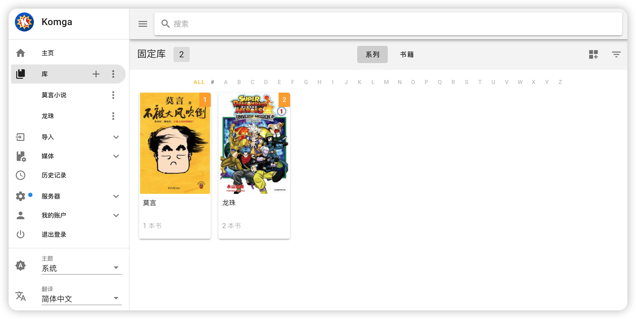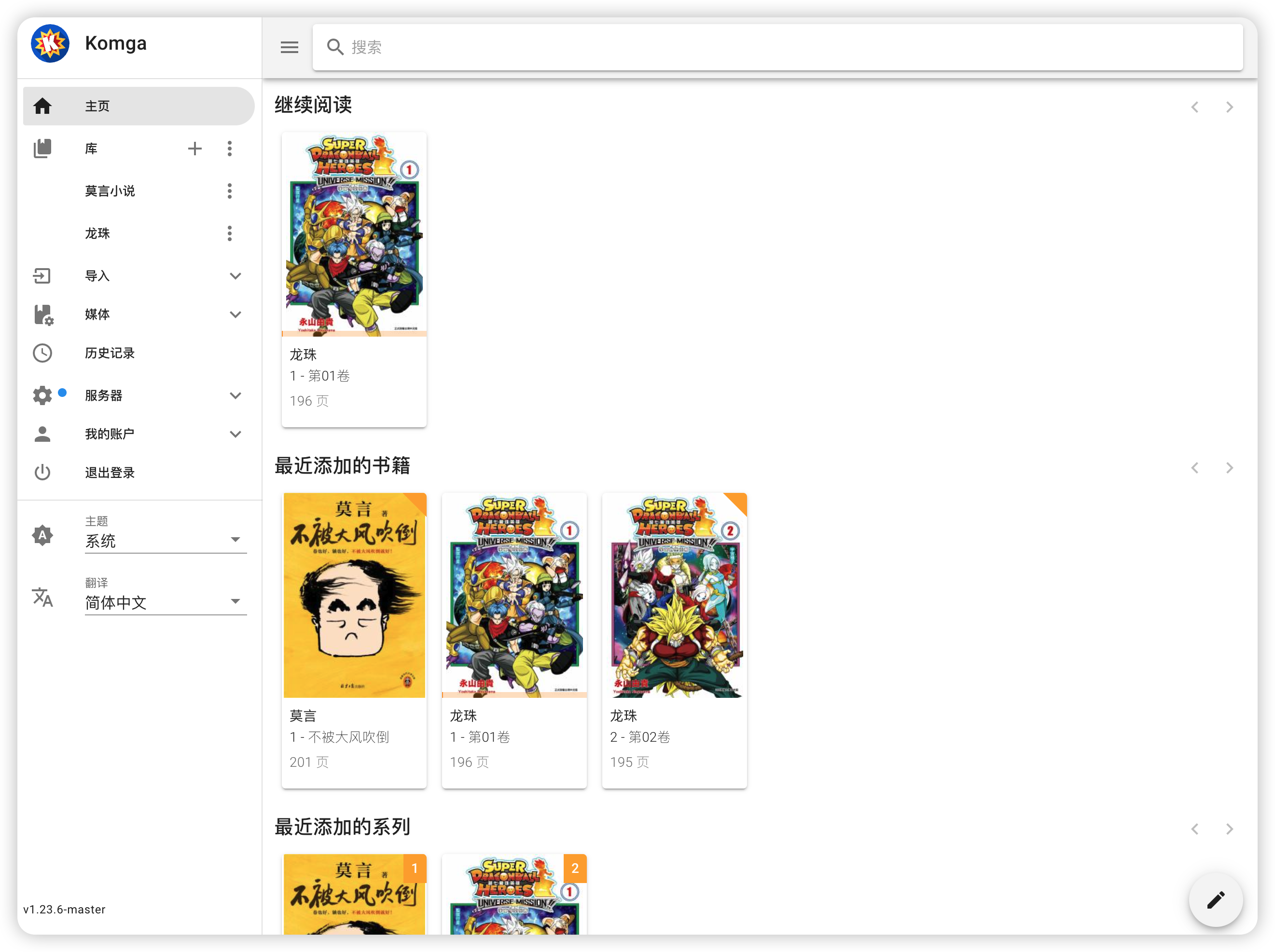 接着回到 komga 页面,点击“添加库”按钮。创建一个“龙珠”的库,选择 data 里“龙珠”这个文件夹。(莫言的那套小说也是同样的操作方法)。
