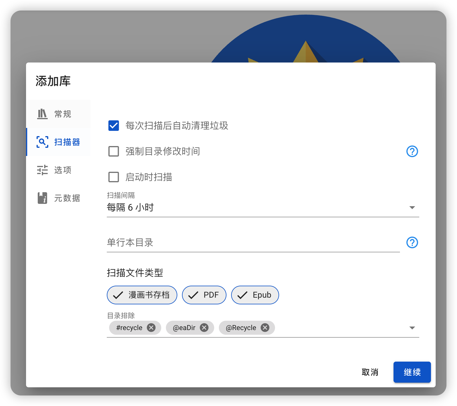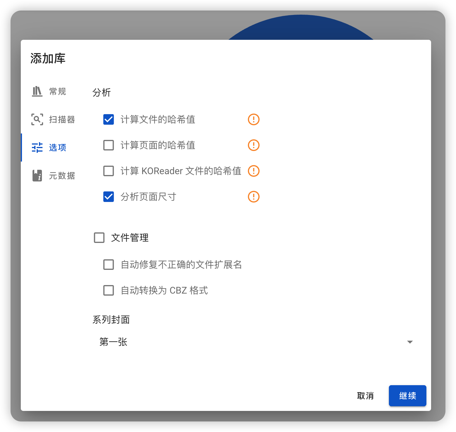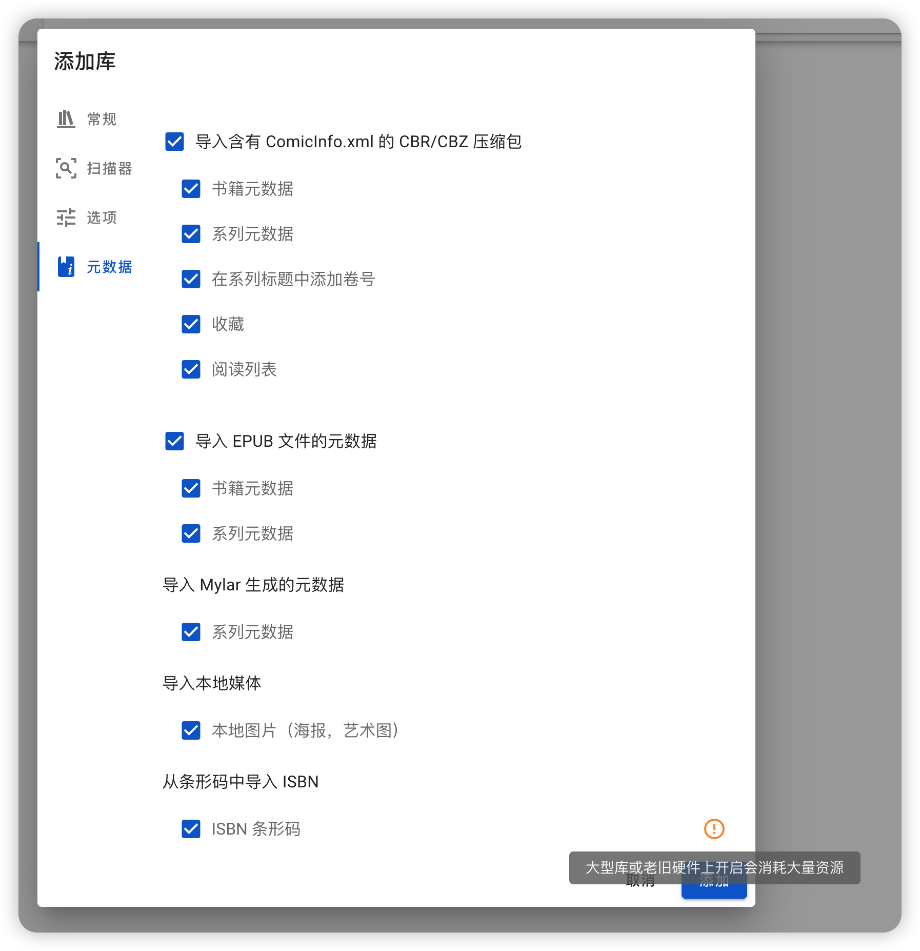 “元数据”这页,我建议把最底部的“ISBN 条形码”勾选上,这能提高书本封面的刮削准确性。