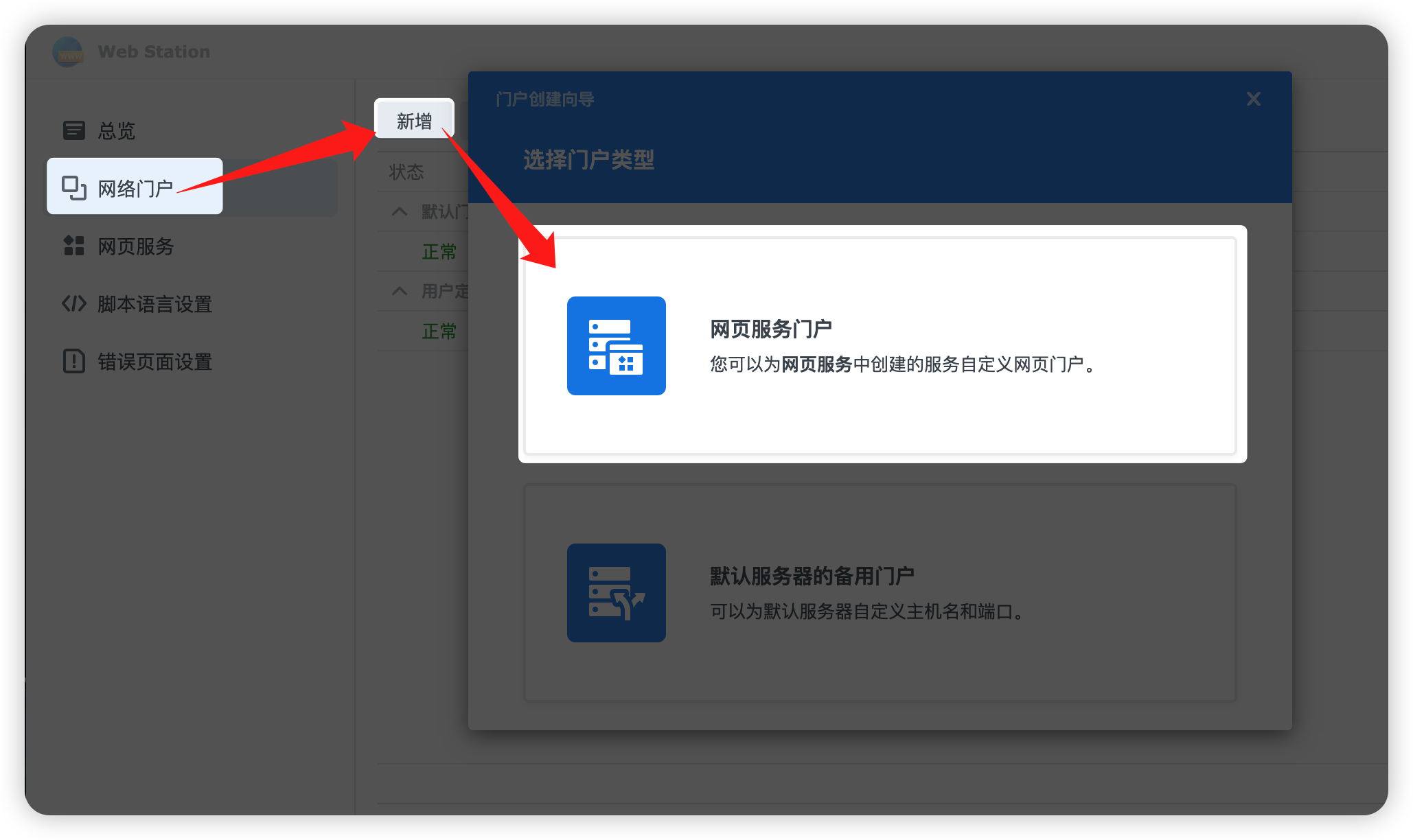 打开“网络门户”,点击“新增”,选择“网页服务门户”。