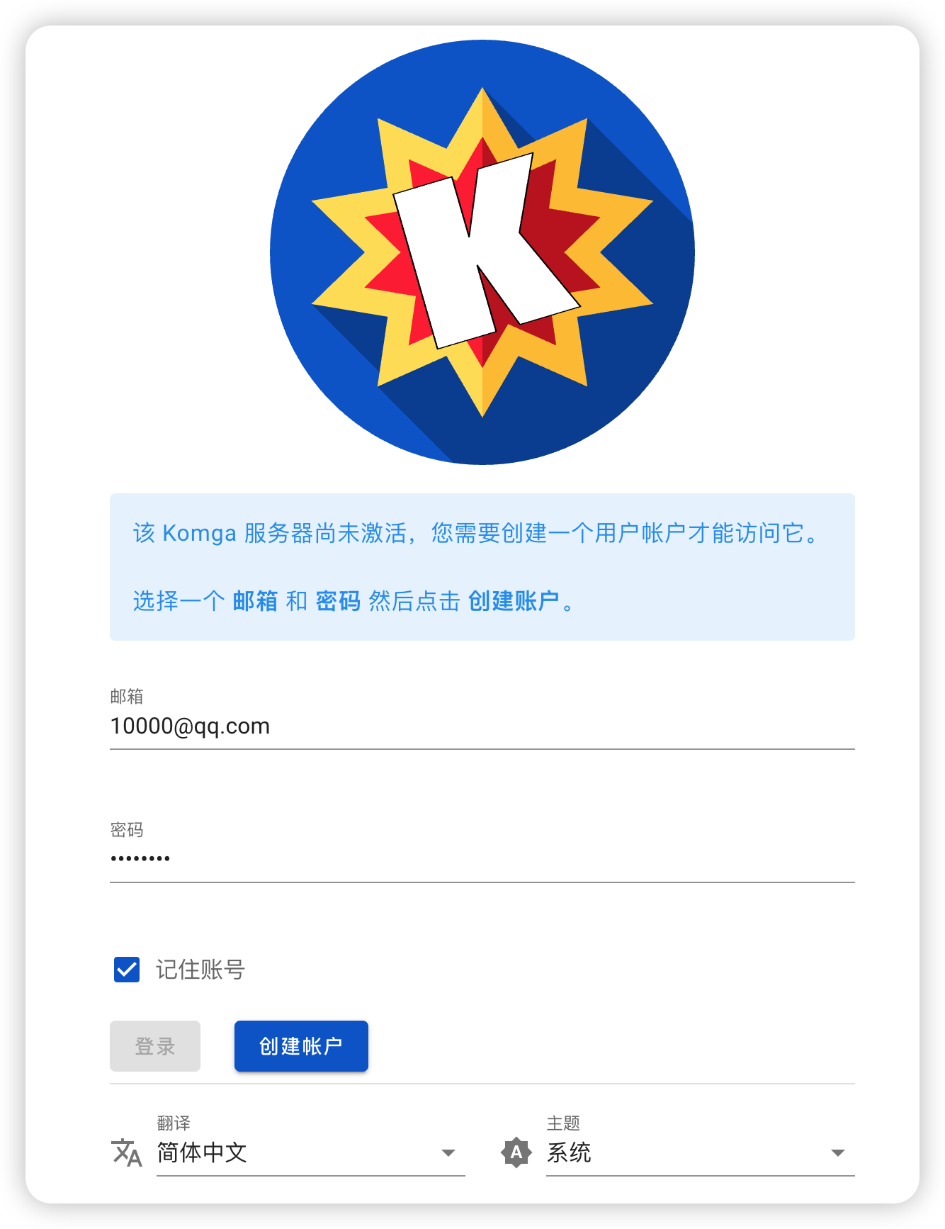 第一次使用 komga 需要创建一个账户,你可以随便输入一个邮箱和密码,但一定要记住它,以后用 komga 就要用这个邮箱和密码登录的。