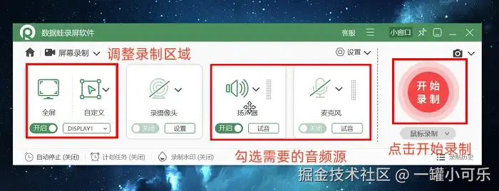 第2步:选定录制模式后,需要先划定屏幕录制范围,同时配置好音频来源。如果想对视频格式、清晰度等参数进行自定义调整,可以通过软件的 “输出设置” 功能,在对应设置界面完成参数修改。所有的参数设置好了之后,找到 “开始录制” 按钮并点击,就会正式启动视频录制了。