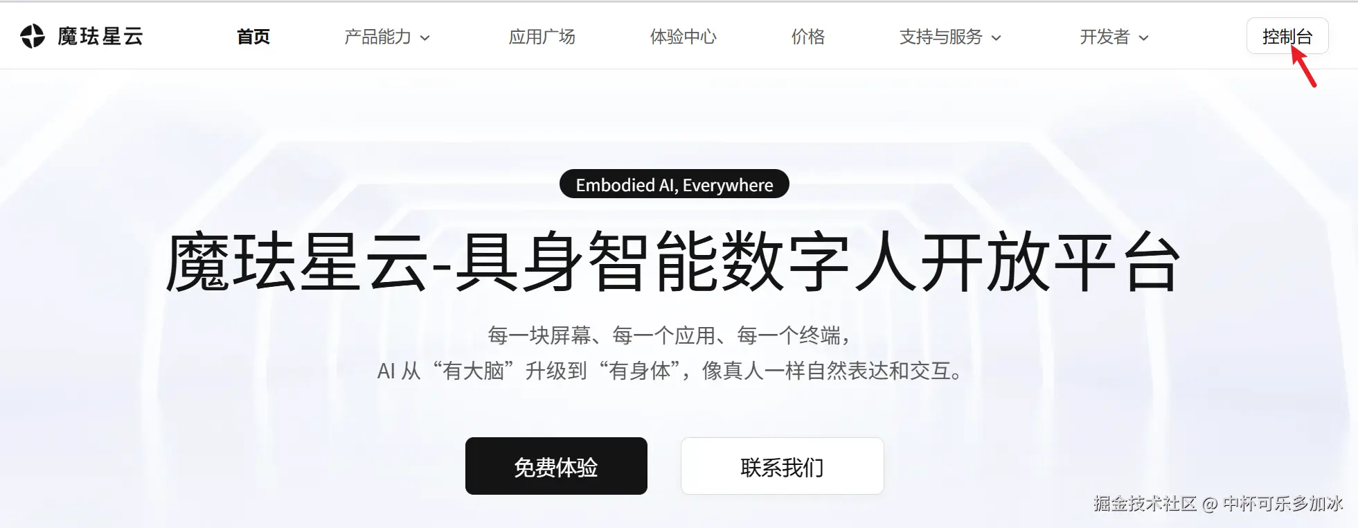 首先我们登录魔珐星云开发者平台(xingyun3d.com?utm_campaign=daren\\&utm_source=kele ),点击右上角进入控制台: