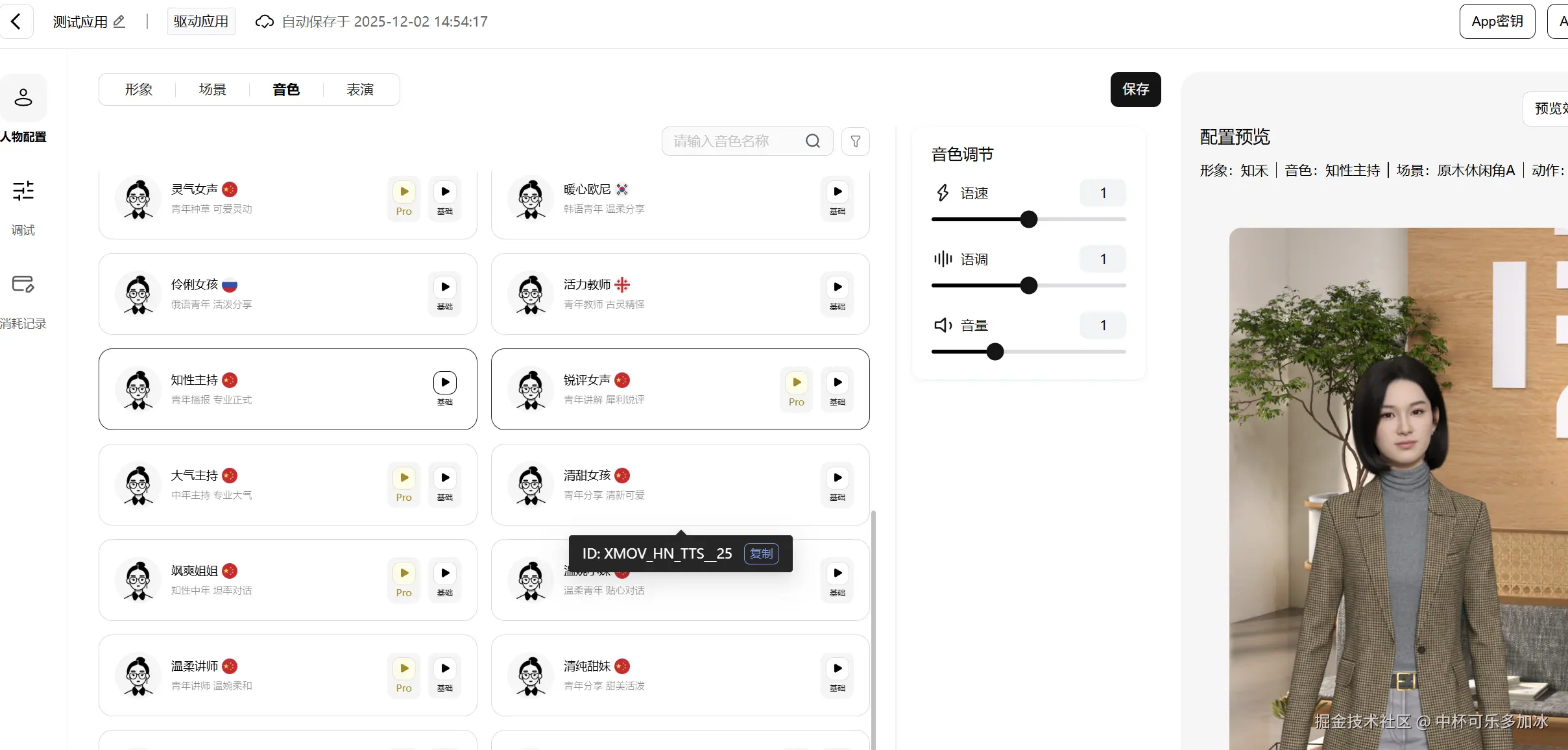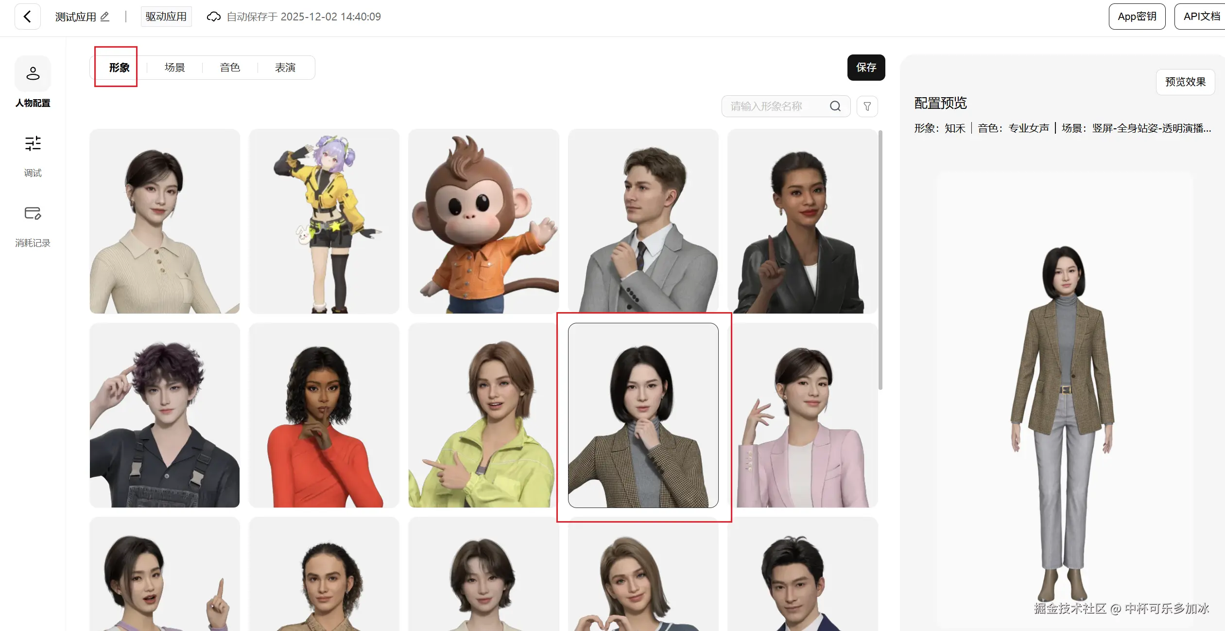 在应用详情页,进入“角色配置”模块。平台提供了多种高精度的 3D 角色库。针对 AI 面试官场景,我们选择一位形象专业、气质干练的“职场精英”角色,以匹配企业招聘的严肃性。