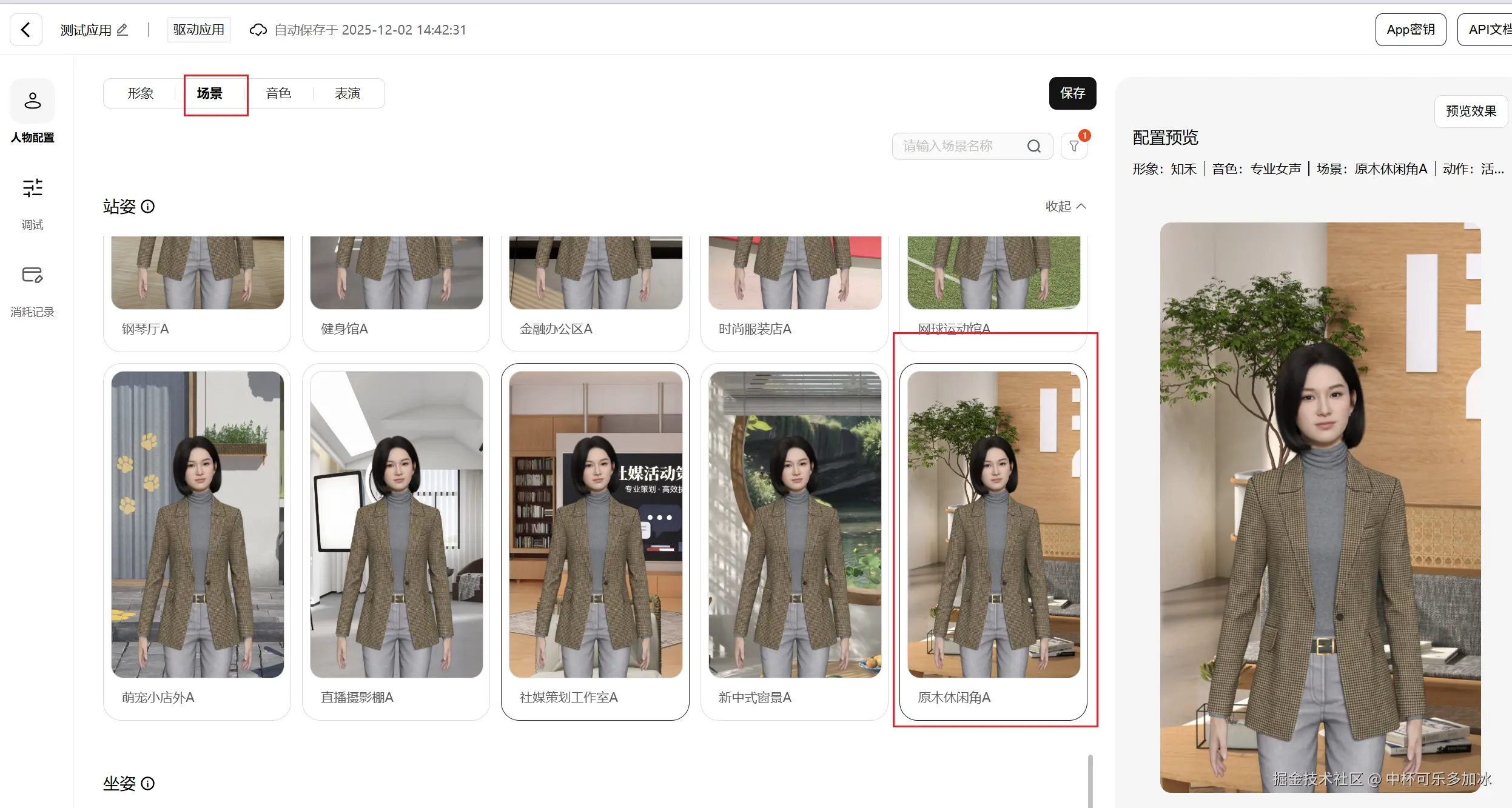 接着,我们配置数字人出现的背景环境,我这里选择了原木休闲角的场景,进一步增强面试的真实感和信任感。