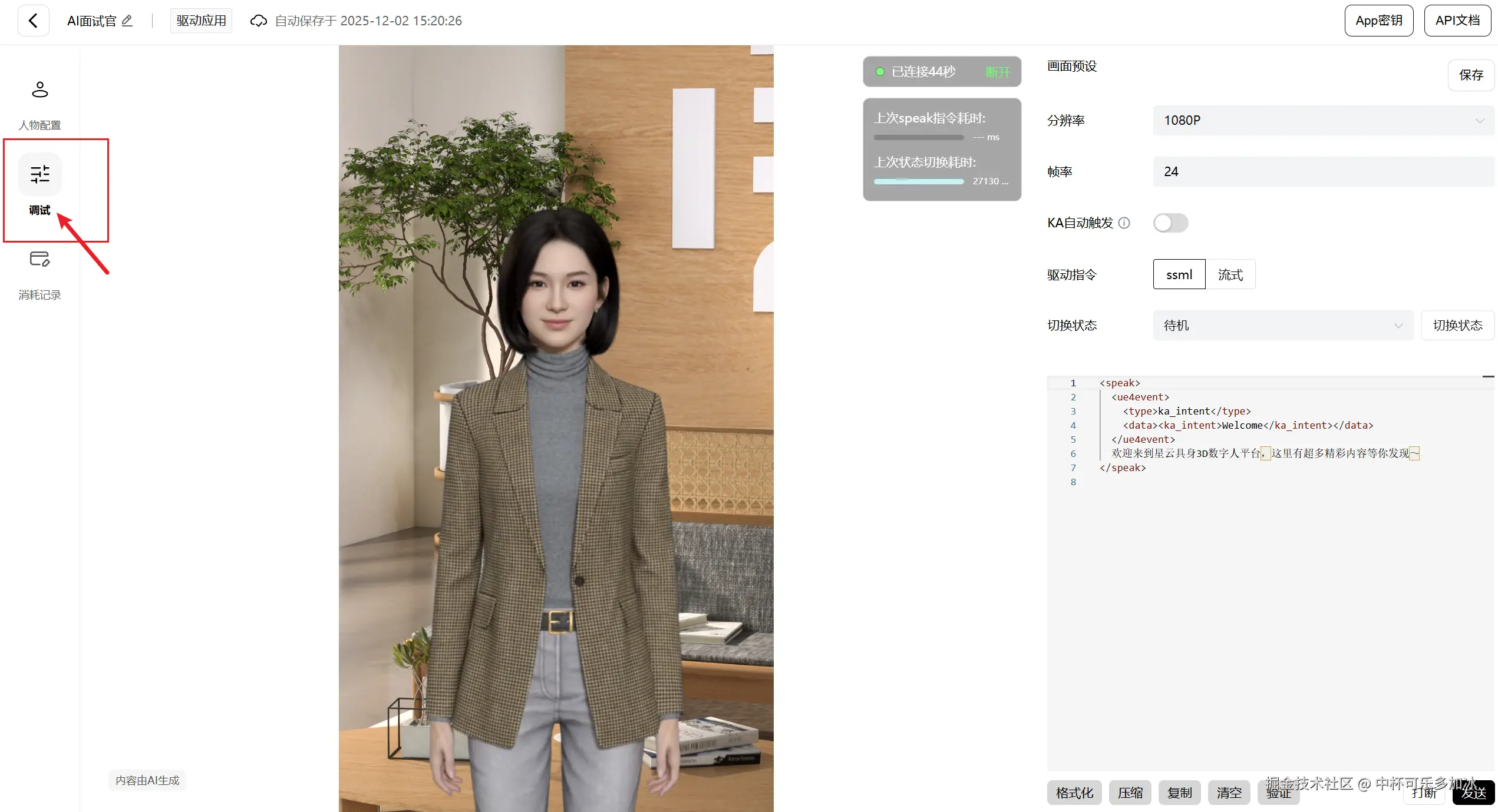 在完成数字人基础配置后,我们需要对其驱动能力进行调试验证。首先,在应用详情页左侧菜单中点击“调试”按钮,进入在线调试面板。