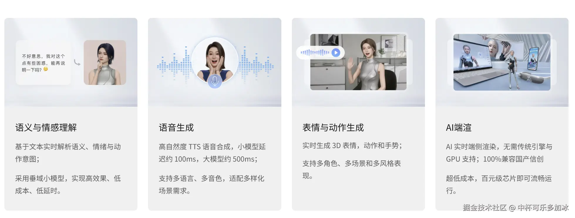 | 低成本部署 | 通过AI端渲技术将渲染负载转移至终端,大幅降低对云端GPU的依赖,使高质量数字人能在普通移动设备上流畅运行。 | AI端渲技术 |