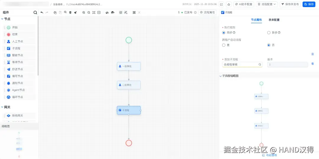 当发起 “采购申请” , “设备维修”,“物料领用” 流程时,在流程中使用子流程节点引用“合规性审核”流程,并配置子流程表单。无需重复搭建子流程,仅通过父流程表单配置,就能适配不同业务场景,维护时只需修改子流程核心规则,所有关联父流程自动同步。大大提升了流程配置和运维效率。