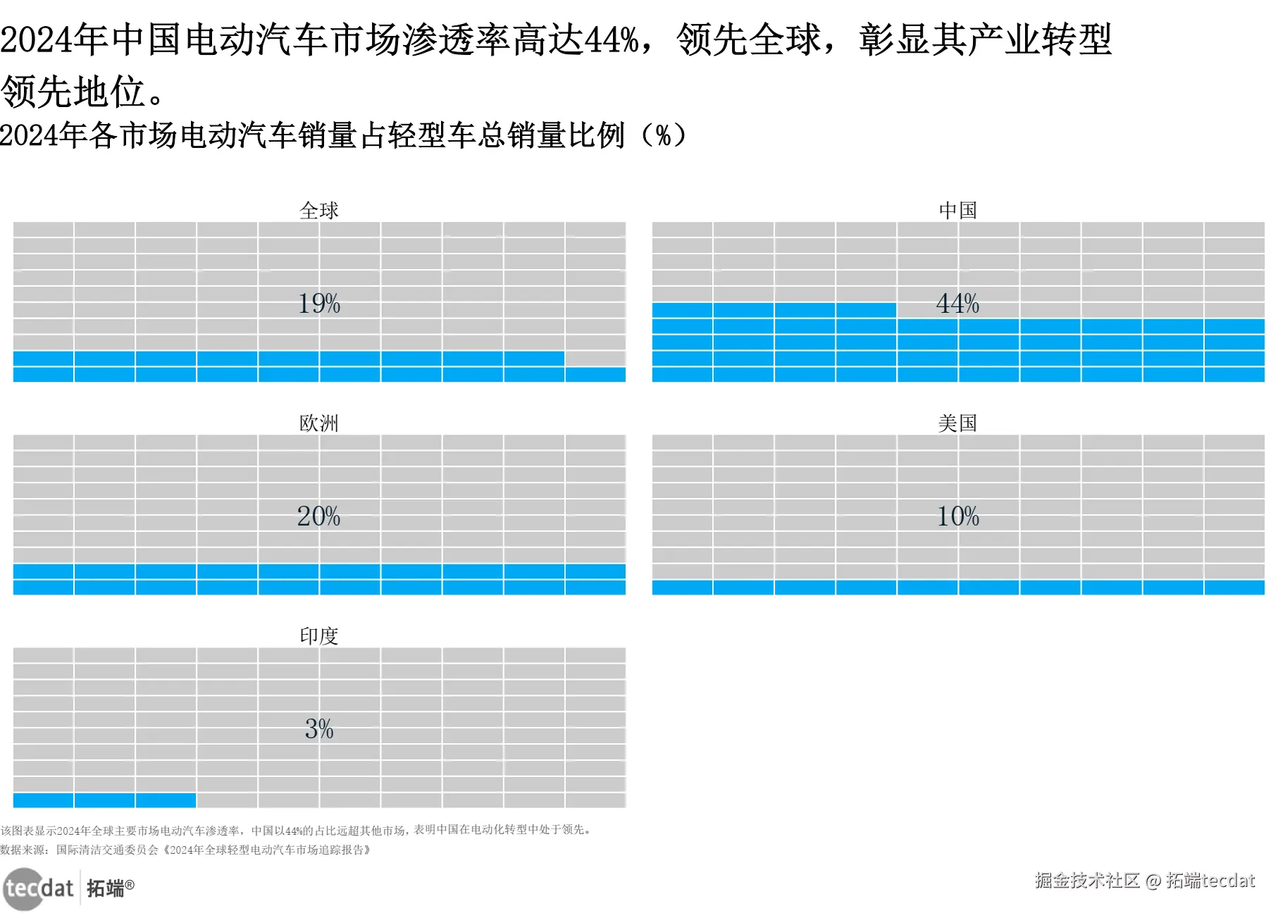 | 全球电动汽车生产份额 | 国际清洁交通委员会《2024年全球轻型电动汽车市场追踪报告》 | 中国占71%,欧洲14%,美国7% | 与部分行业预估的“中国66%”存在差异 | 统计范围不同:本报告仅聚焦“轻型电动汽车”(乘用车+轻型商用车),部分预估含中重型商用车,导致份额偏低 |