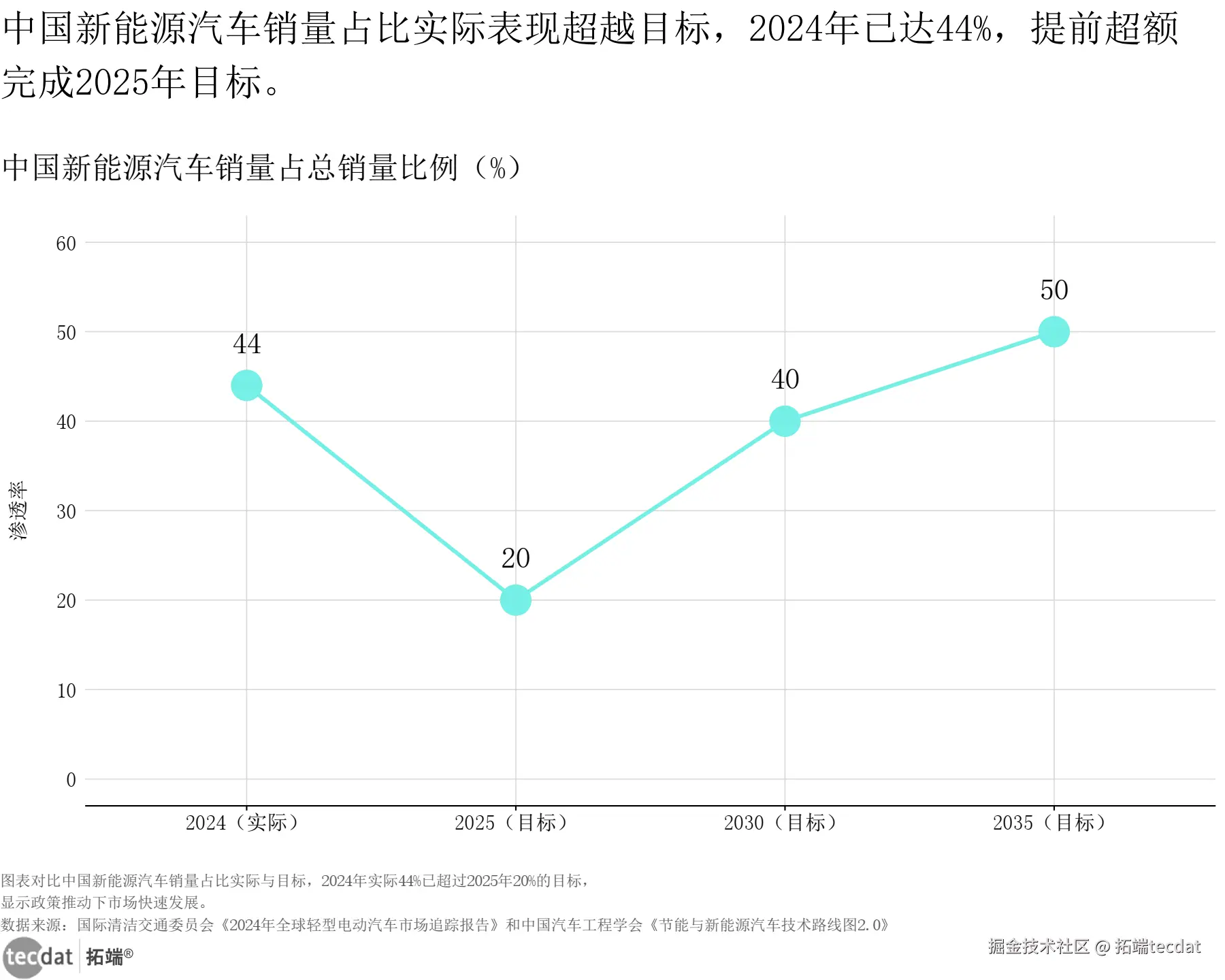| 中国新能源汽车渗透率 | 中国汽车工程学会《节能与新能源汽车技术路线图2.0》 | 2025年目标20%,2035年50%+ | 与百度《2025年汽车行业研究报告》的“2025年出口占比41.1%”无冲突 | 统计维度不同:技术路线图是“整体销量占比”(含国内+出口),百度报告是“出口销量中新能源占比”,出口端新能源渗透率天然高于国内整体 |