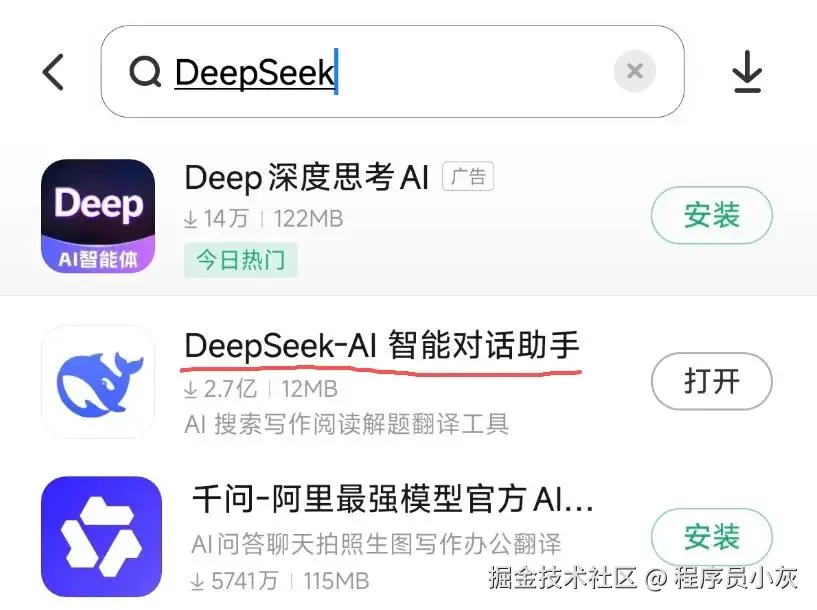 DeepSeek的APP,可以在手机应用搜索关键词“DeepSeek”,找到“DeepSeek-AI智能对话助手”这个应用: