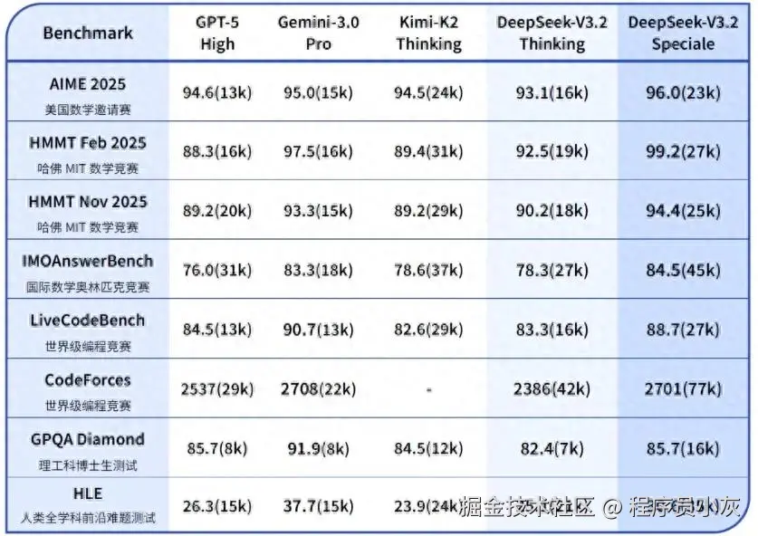 从下面这张表格中,可以具体看到DeepSeek-V3.2、DeepSeek-V3.2-Speciale这两大模型与其他主流模型的基准测试成绩对比: