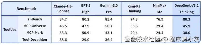 多亏了这个解决方案,DeepSeek-V3.2在工具调用这一项基准测试中拿到了不错的成绩,甚至战胜了GTP-5: