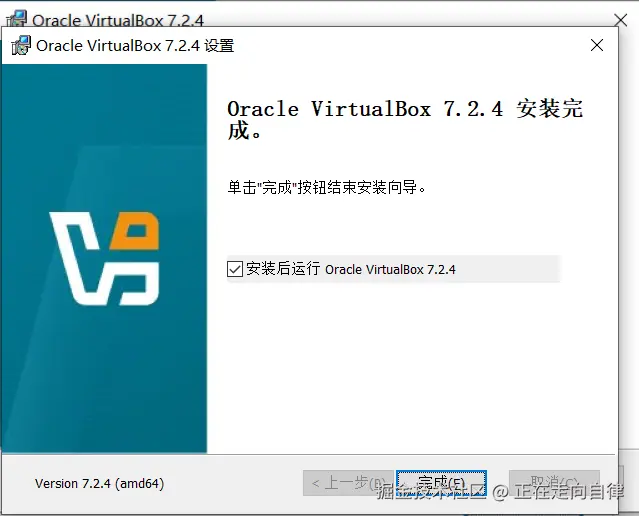 - 安装完成后,点击"完成"启动VirtualBox。
