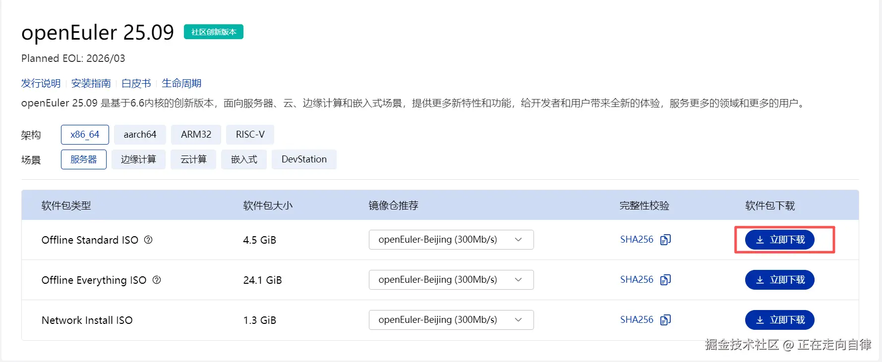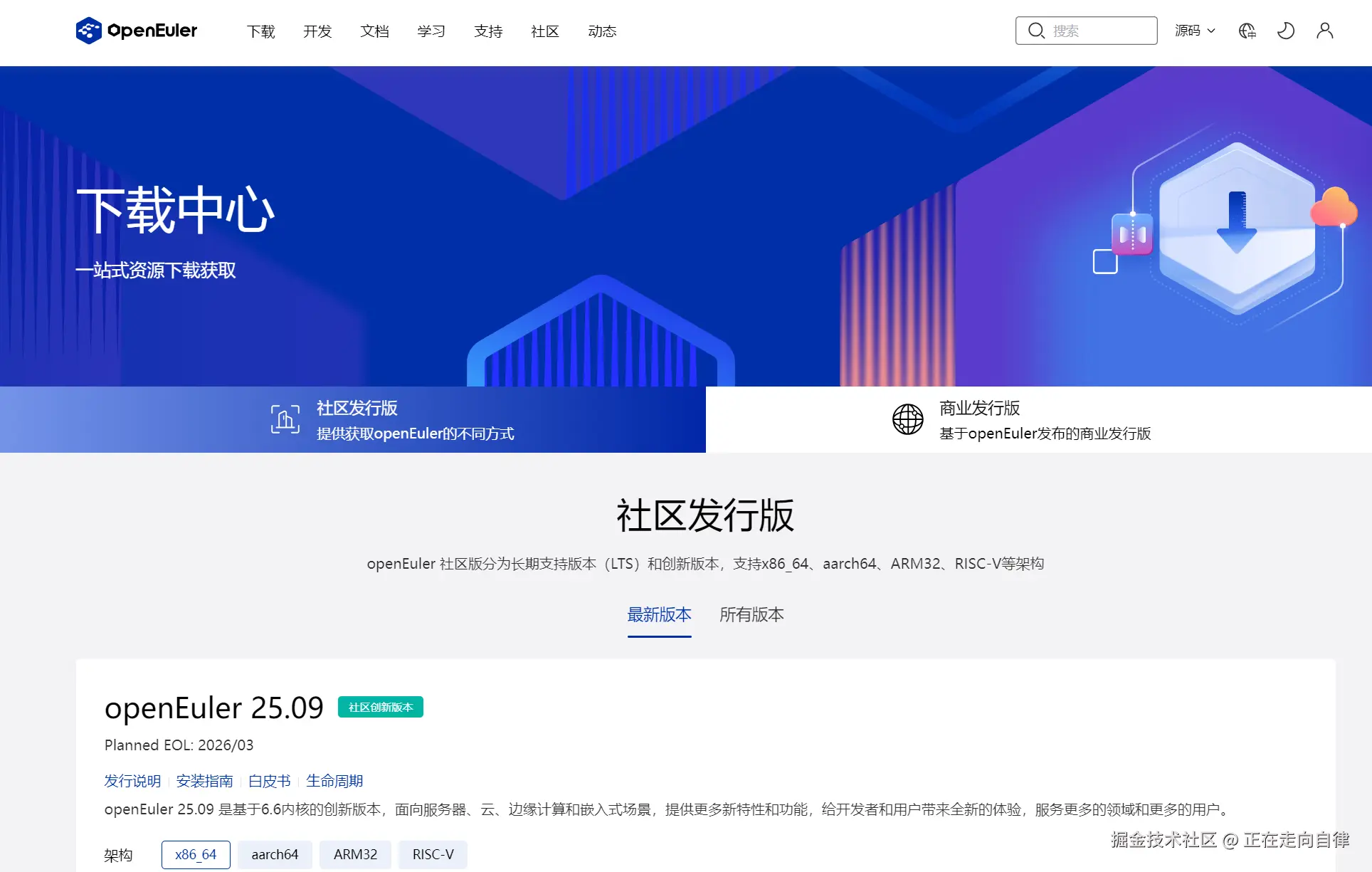 首先访问openEuler官网(www.openeuler.org/),在“下载”区域可以看到多个版本。我选择了openEuler 25.09 LTS版本,毕竟长期支持版更适合稳定使用。官方安装文档:安装准备 | 文档 | openEuler社区
