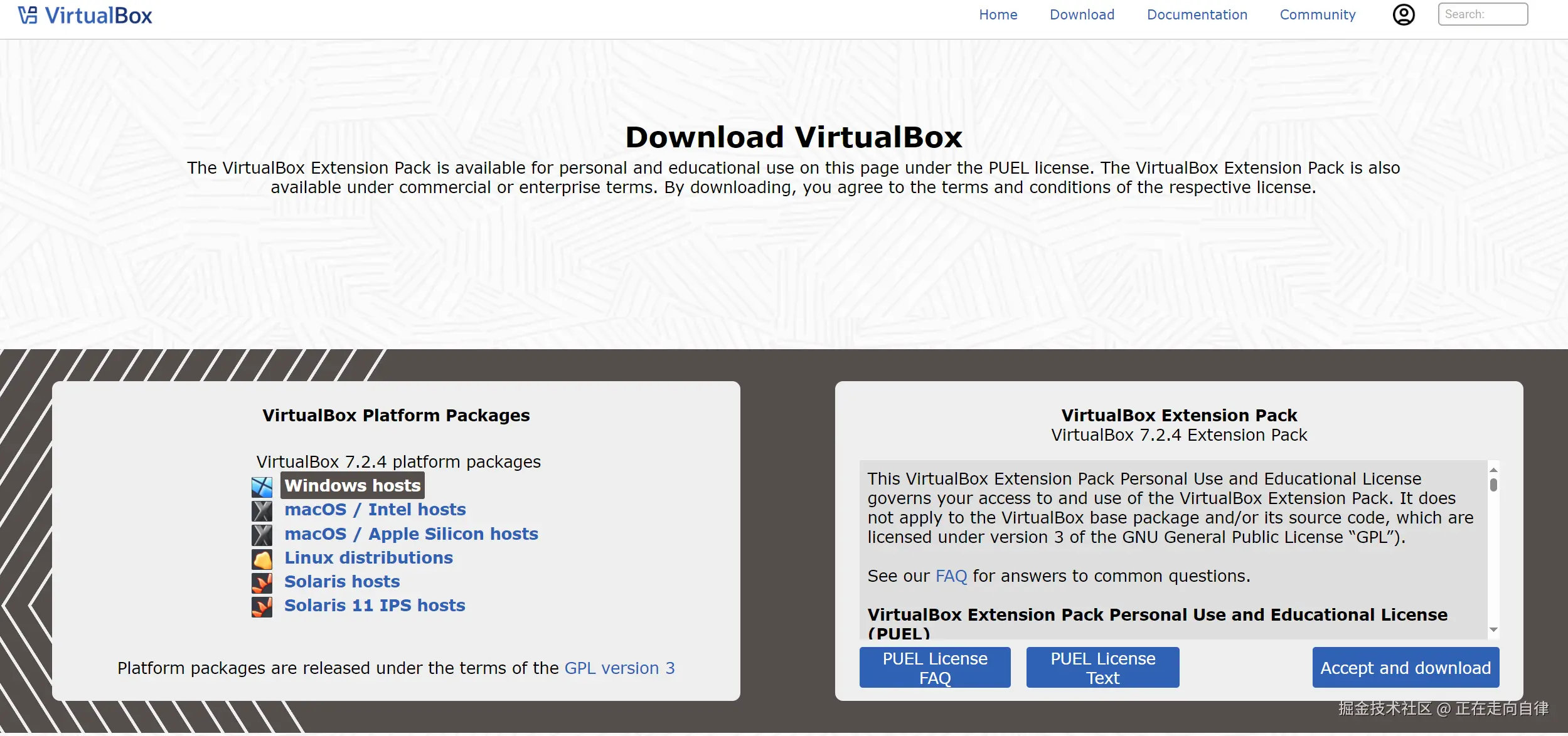- 访问VirtualBox官网(www.virtualbox.org/),点击"Windows hosts"下载最新的安装程序。