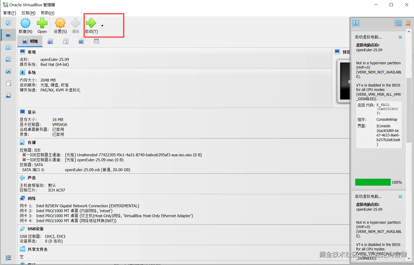 - 在VirtualBox主界面,选择配置好的虚拟机,点击"启动"按钮(绿色箭头图标)。