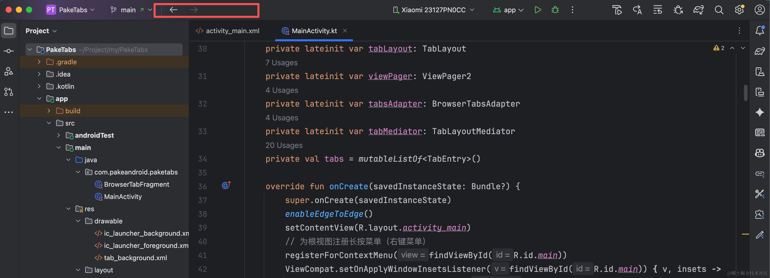最新版本没办法在菜单栏中显示toolbar自带前进和后退按钮了,需要在设置中手动增加