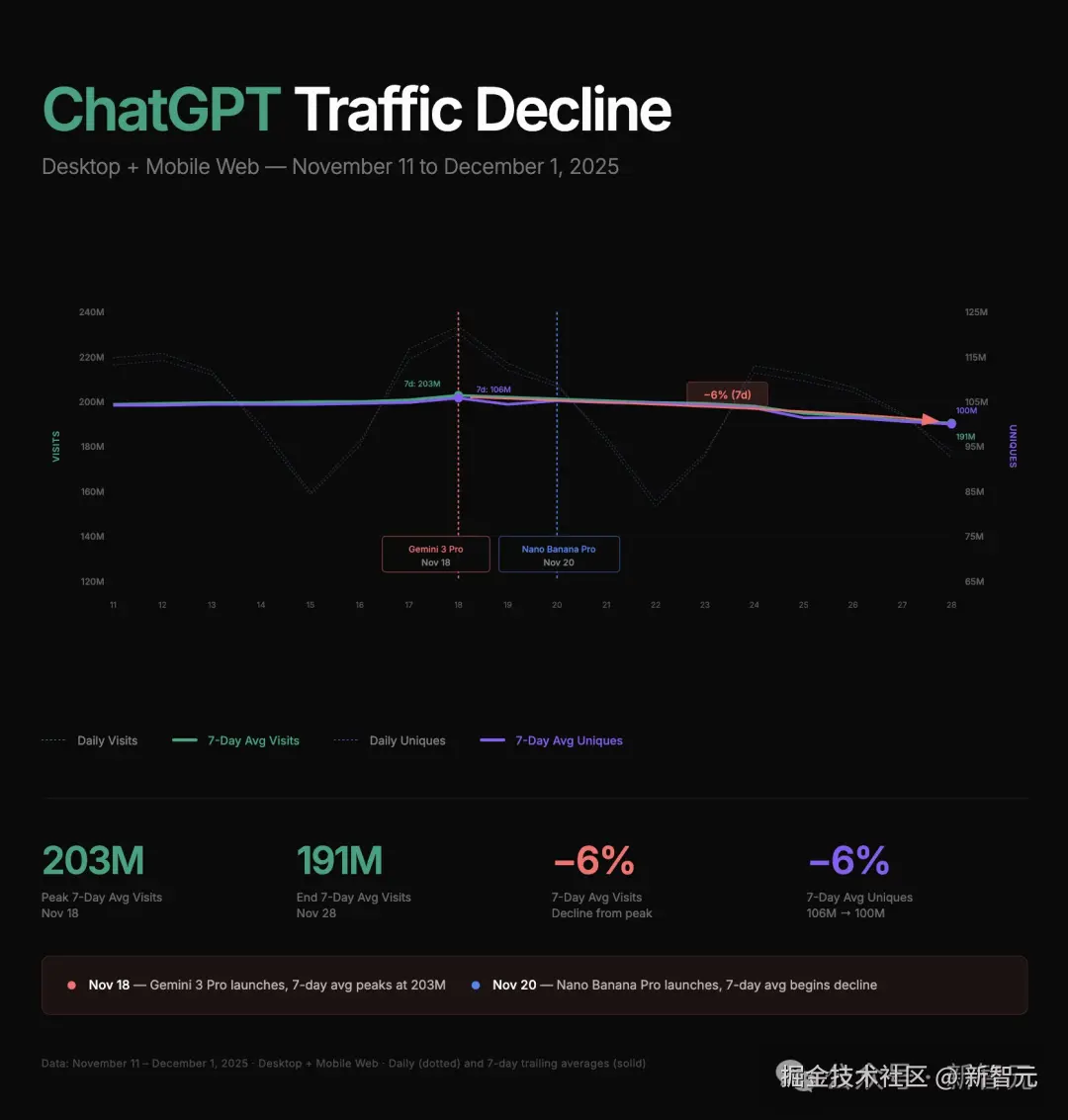 Gemini 3 发布两周后,ChatGPT 日活跃用户下降了 6%