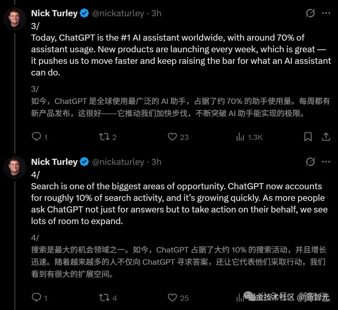 - OpenAI 表示,ChatGPT 目前承担了全球 70% 的「AI 助手活动」和 10% 的「搜索活动」。