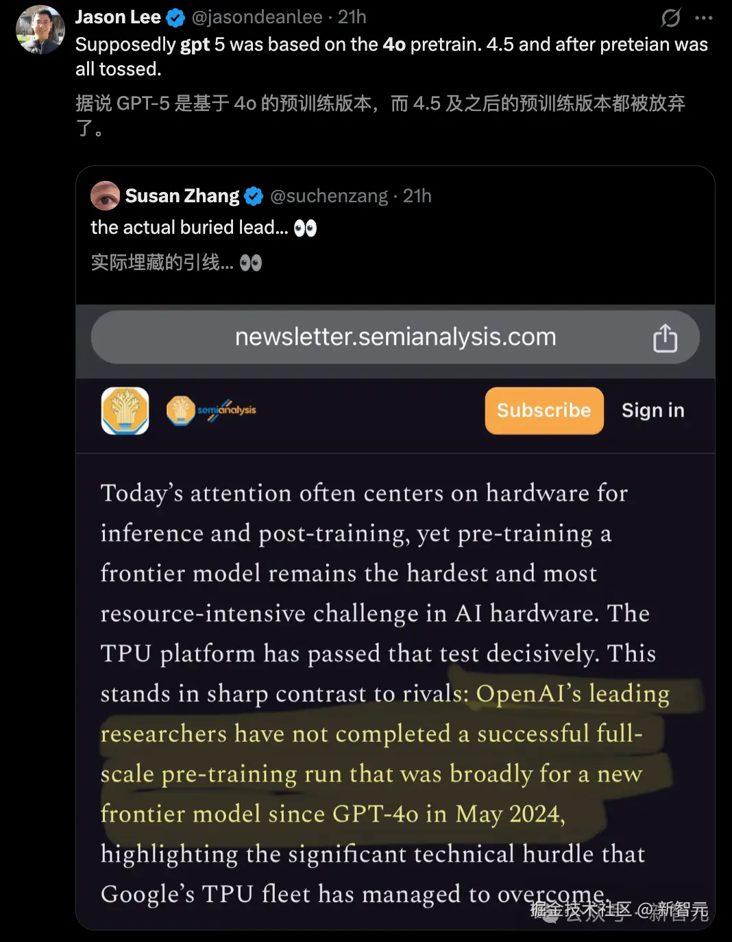 此前,不仅 Information,还有 SemiAnalysis 多家外媒爆出,自 GPT-4o 之后,OpenAI 尚未完成下一代前沿大模型的预训练上。