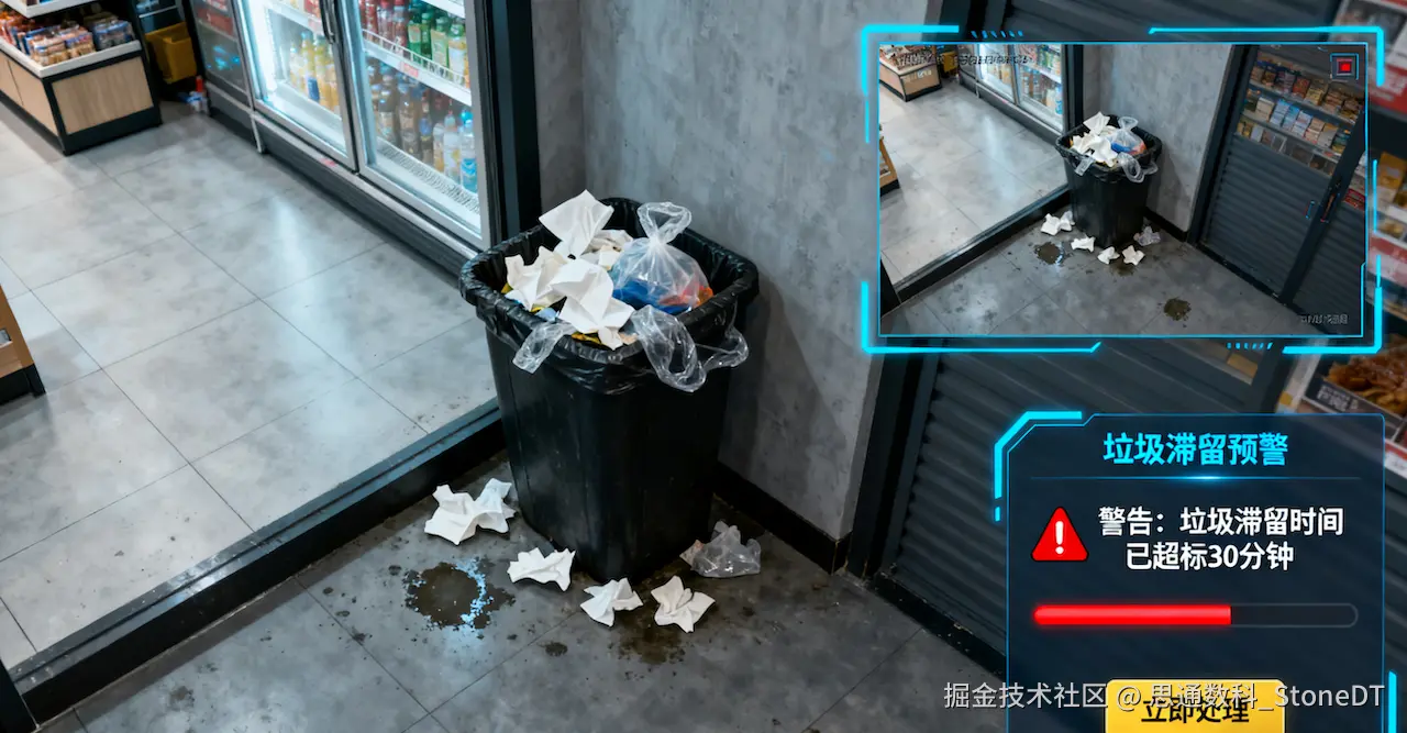 过去:地面水渍和通道被杂物堵塞是顾客投诉和安全隐惠的高发区。店员难以时刻紧盯监控,等问题被发现时,往往为时已晚——轻则顾客投诉,重则可能引发滑倒摔伤等安全事故。