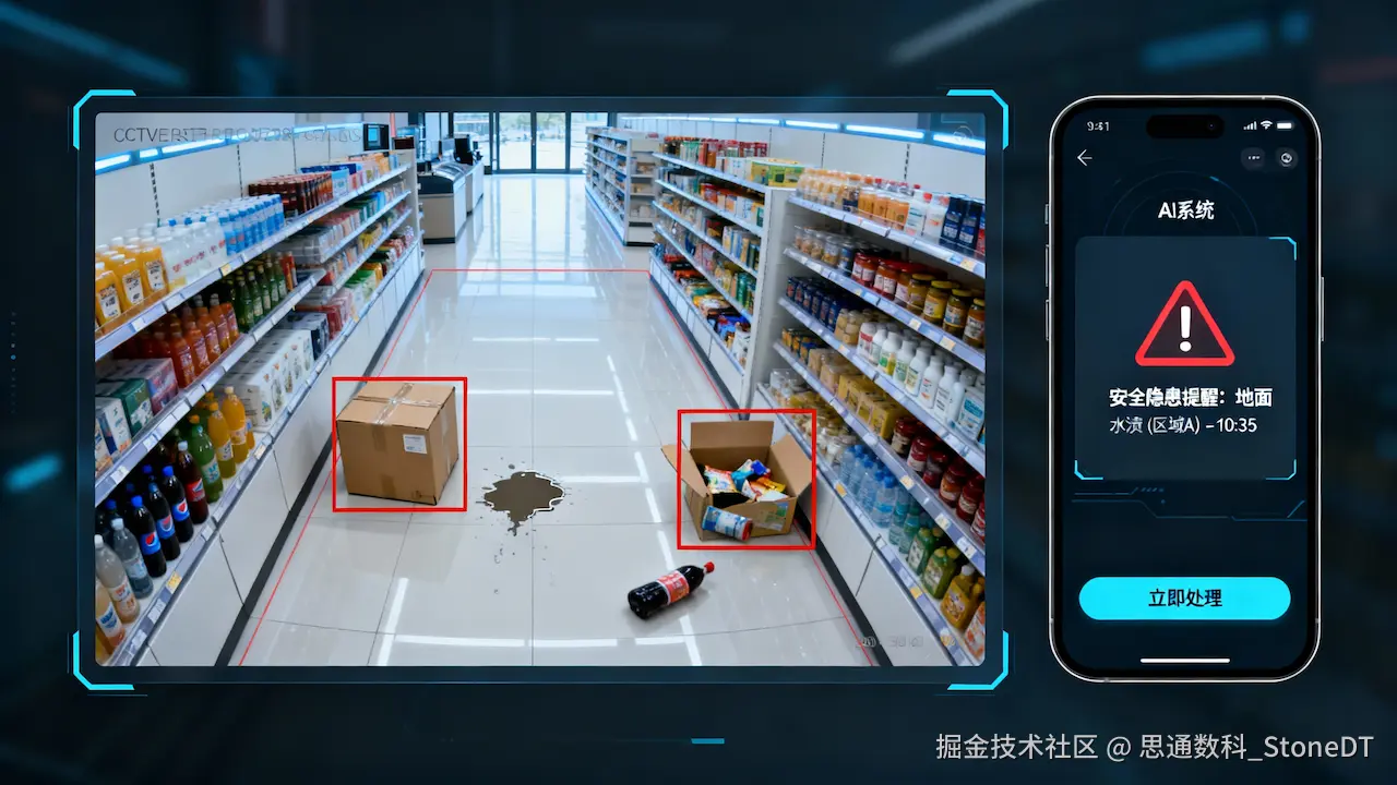 现在:在引入思通数科AI数智店商系统的AI巡检功能后,情况发生了根本性改变。系统能够"7x24小时实时识别"地面水渍、通道障碍物和散落货品等潜在风险,并在风险发生的"秒级内",将告警信息与现场截图直接推送至店长或相关责任人的手机。
