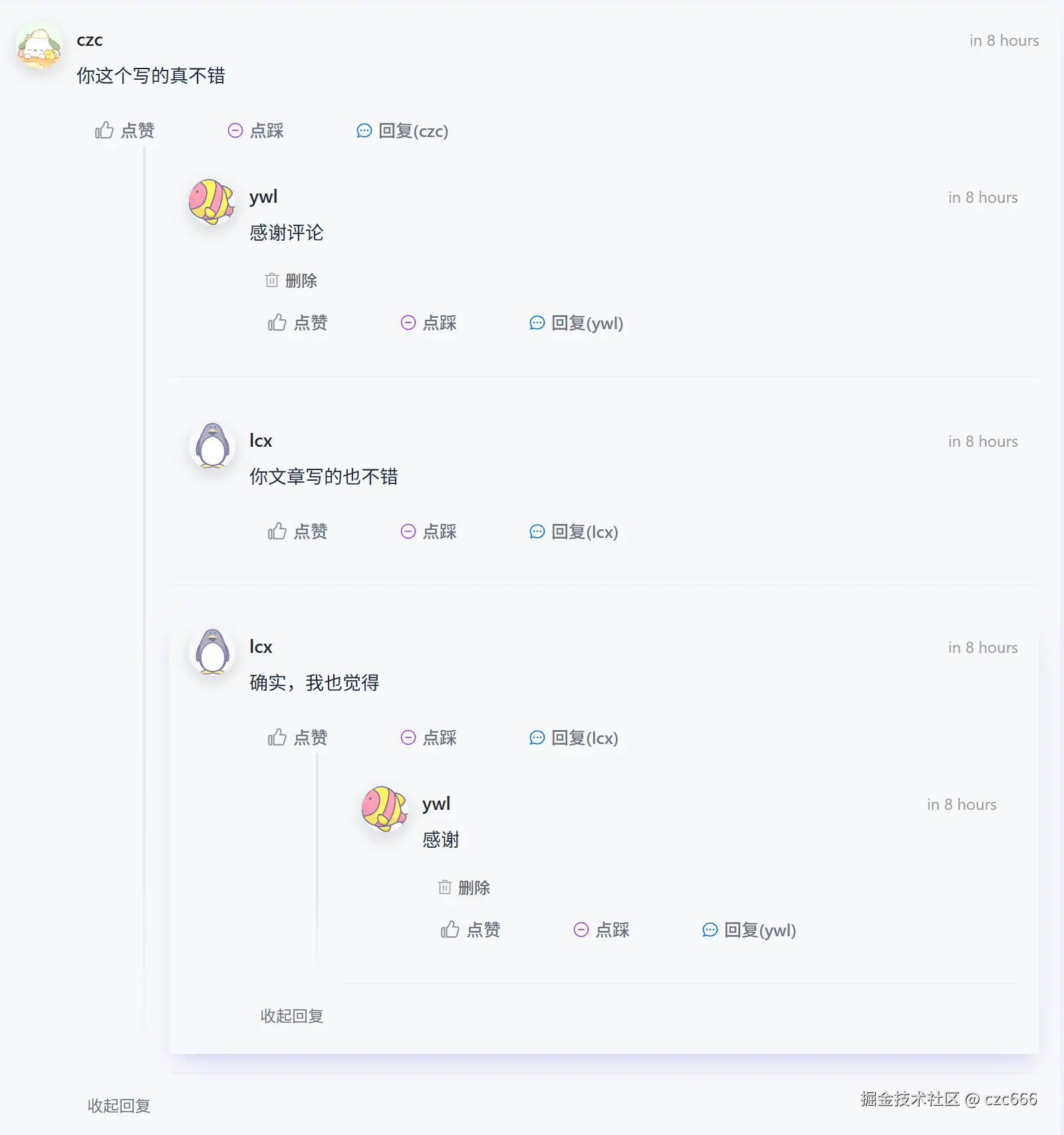 无限层级评论树指的是一个可以无限展开的树形评论区结构,每一层的回复被挂载在父评论上,可以无限展开。最终要实现是下面的效果:每一条评论都有一个展开回复/收起回复,点击之后就会有更多评论被渲染或者被收起,当然要有回复才能展开,对于同级评论最后一条评论之后又展开更多表示渲染更多评论。