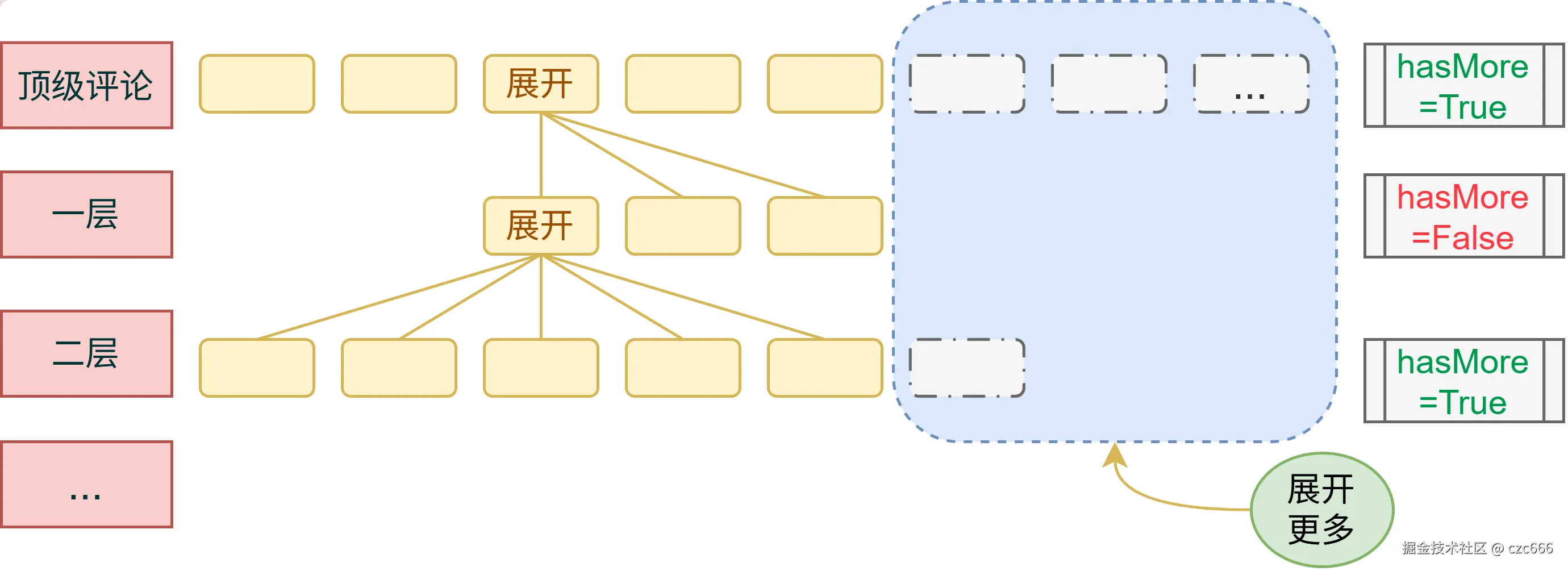 假设每次请求五条数据,黄色为已经渲染的数据,蓝色为存在但未请求的,绿色展开更多指示了蓝色框如果还有更多评论那么需要点击展开更多请求更多数据。可以看到顶级评论请求了五条数据,显然顶级评论还有更多(hasMore=True),此时可以点击展开更多请求更多同级数据,然后继续挂载到递归单元的链上。点击顶级评论第三条评论的展开回复,子评论只有三条,因此只能渲染三条,此时不能继续展开更多(hasMore=False),第一层的第一条子评论有回复,可以继续点击展开回复渲染更多子评论,渲染第二层...就这样可以无限递归叠加下去。