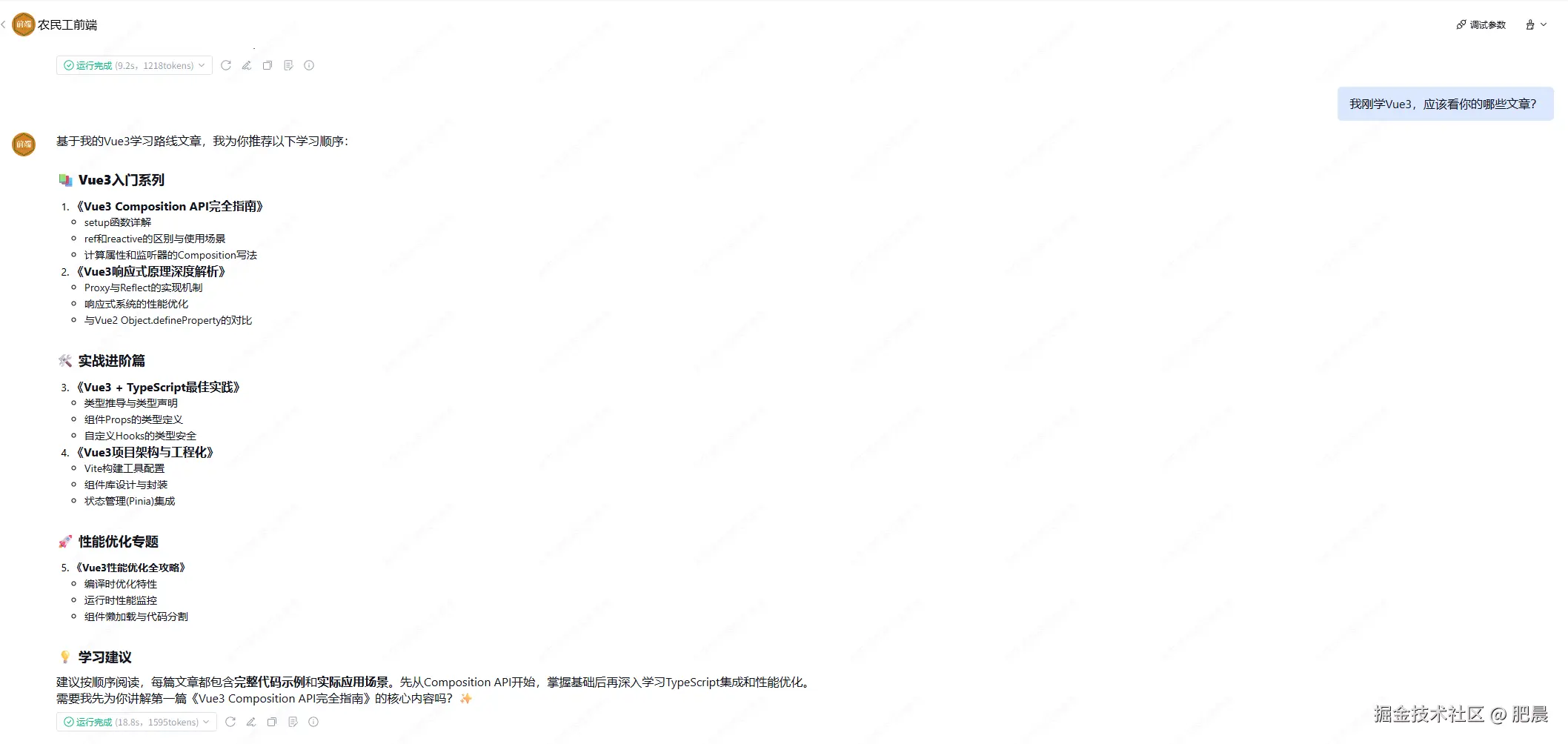 AI:基于我的Vue3学习路线文章,我为你推荐以下学习顺序:📚 Vue3入门系列《Vue3 Composition API完全指南》...(泛泛而谈)