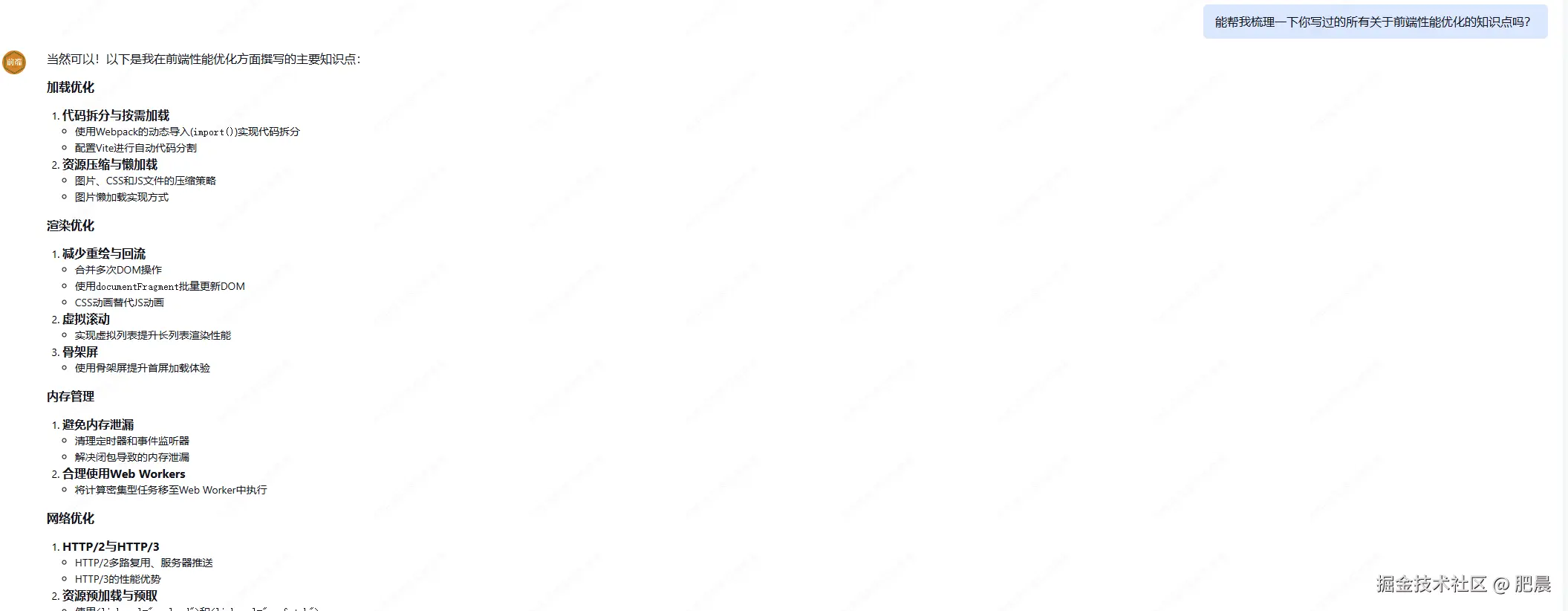读者:能帮我梳理一下你写过的所有关于前端性能优化的知识点吗? AI: 当然可以!以下是我在前端性能优化方面撰写的主要知识点:加载优化代码拆分与按需加载使用Webpack的动态导入(import())实现代码拆分配置Vite进行自动代码分割资源压缩与懒加载图片、CSS和JS文件的压缩策略图片懒加载实现方式渲染优化...(泛泛而谈)