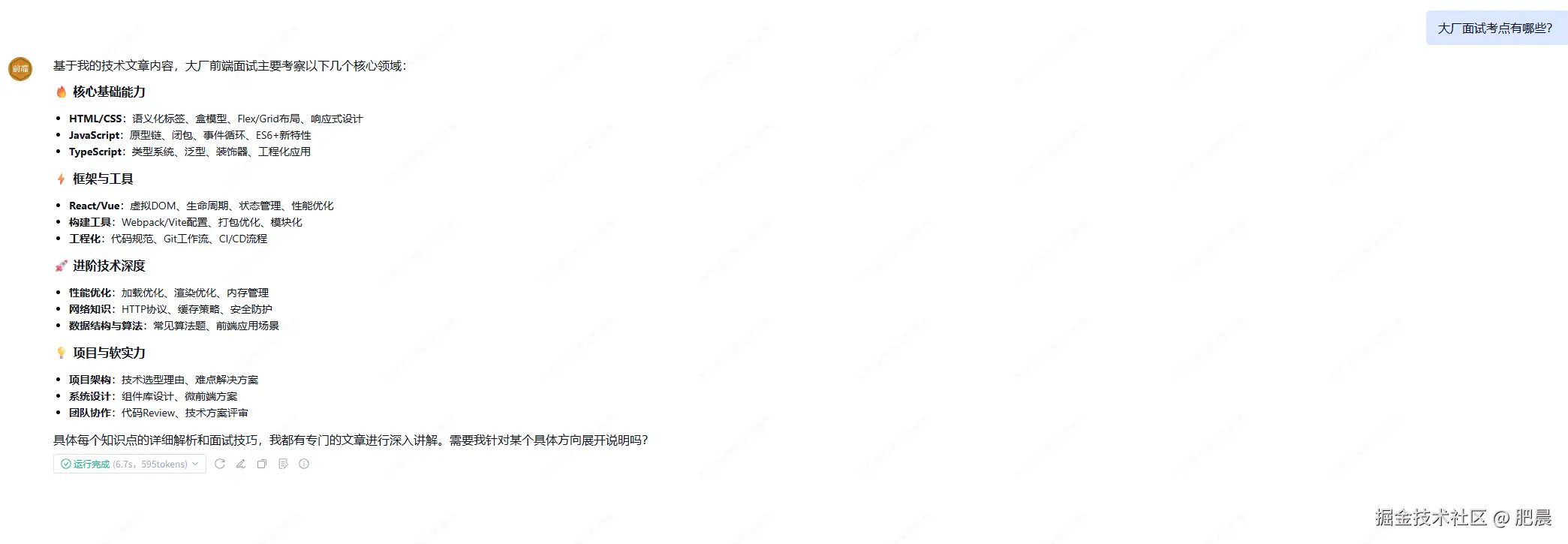 我:大厂面试考点有哪些? AI:基于我的技术文章内容,大厂前端面试主要考察以下几个核心领域:🔥 核心基础能力 HTML/CSS:语义化标签、盒模型、Flex/Grid布局、响应式设计...(泛泛而谈)
