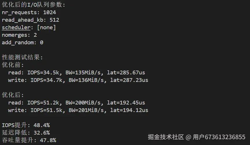 echo "优化后的I/O队列参数:"
