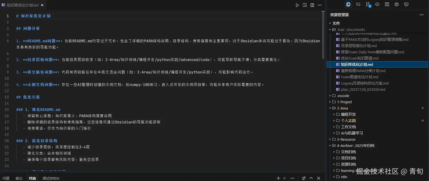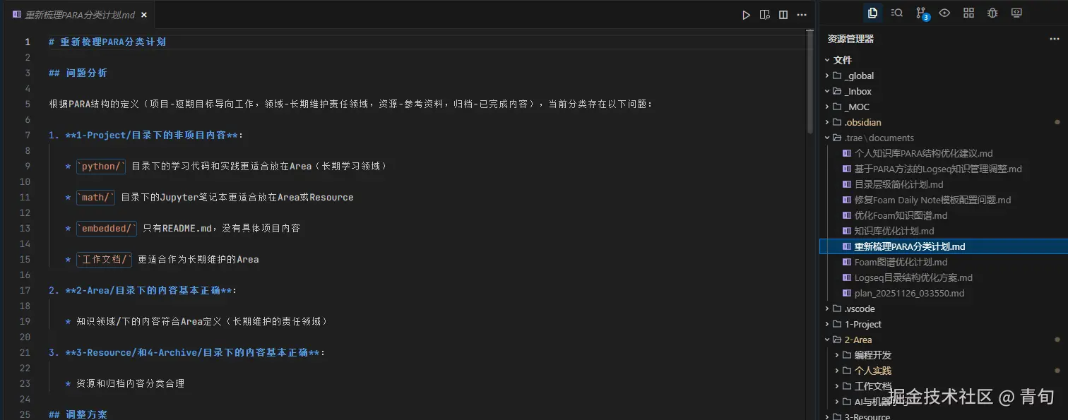 我们选用 Obsidian+git+tran cn. 来进行自己的知识管理。很简单,一个空文件夹,然后告诉 solo 我们要创建基于 PARA 方法进行个人知识管理,inbox 作为临时目录放入需要待整理的我们之前的做过的 markdown 文件,记得勾选 plan.让它新给出计划,我们和他通过计划对其价值观。对齐后,让它执行计划就可以了。