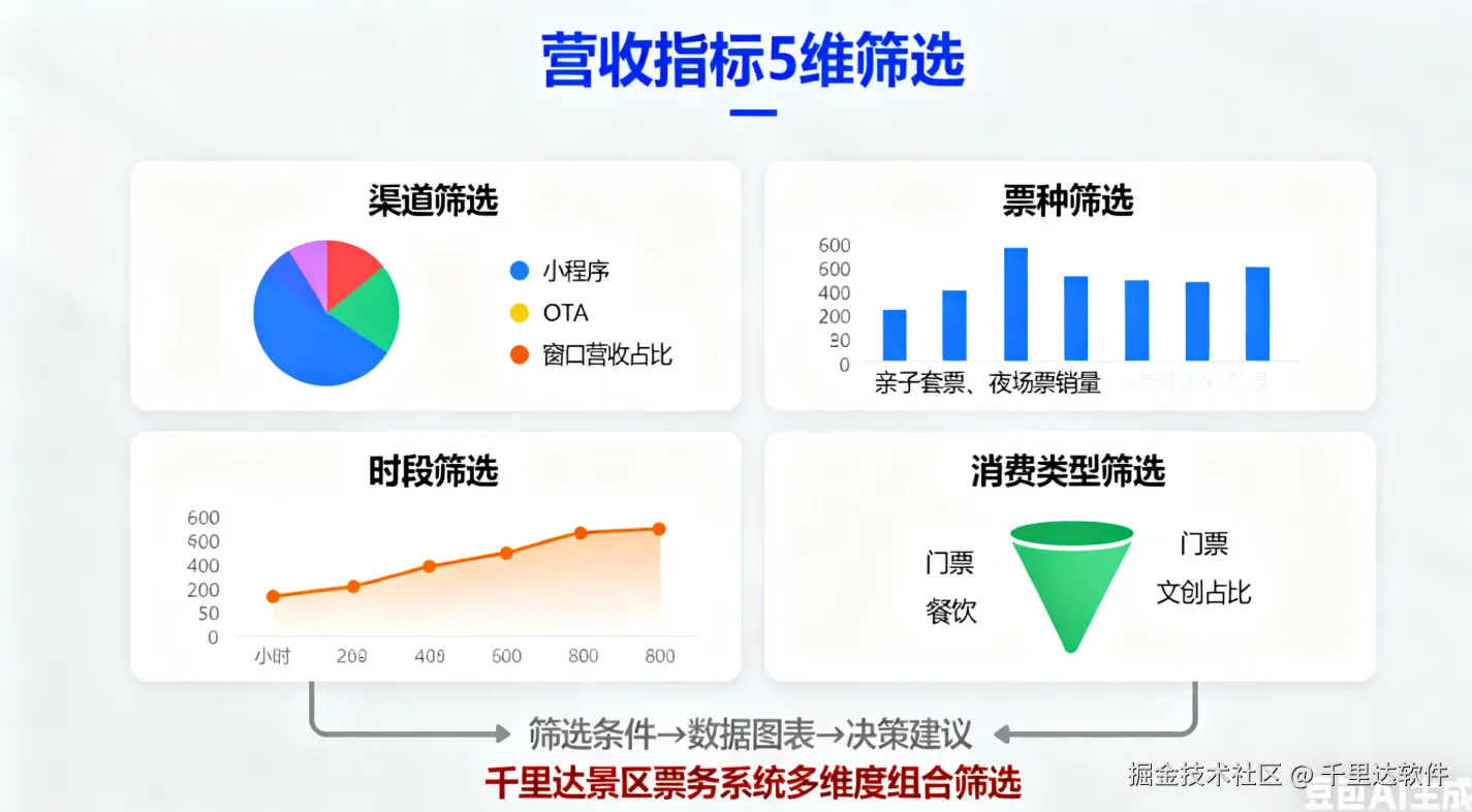 不同销售渠道(窗口、小程序、OTA、旅行社)的营收占比,直接影响景区渠道合作策略。筛选时需重点关注 “渠道营收额、订单量、客单价” 三大子指标: