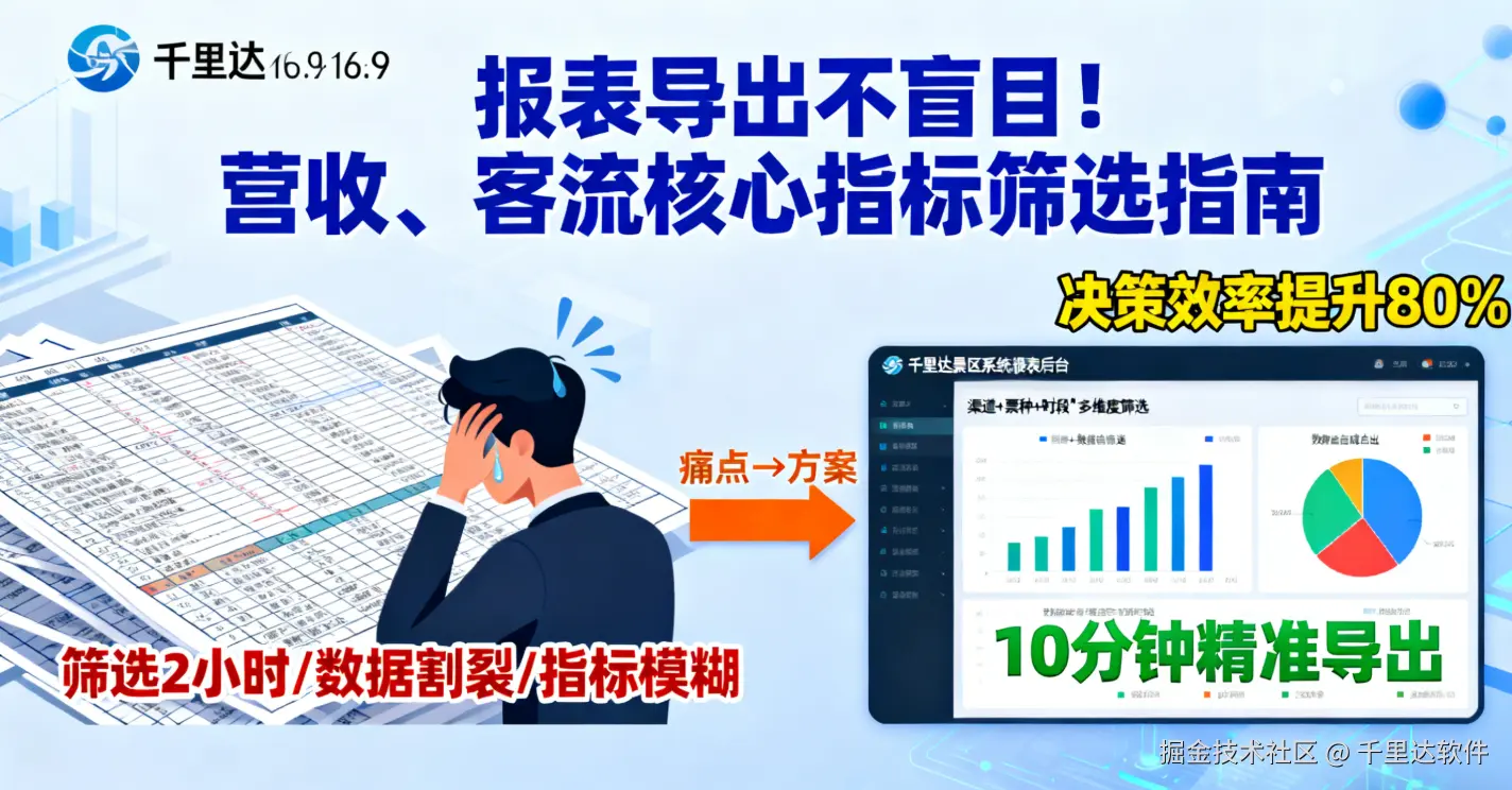 基础数据报表是景区运营决策的 “数据基石”,但很多景区因报表系统 “筛选功能单一、指标维度模糊、数据不联动”,导致导出的报表 “大而无用”—— 要么数据杂乱难分析,要么关键指标缺失,运营者只能在海量数据里 “找信息”,而非用数据 “做决策”。而千里达智慧景区依托 “千里达景区票务系统” 的精细化报表功能,结合 “千里达智慧景区一体化管控平台” 的跨模块数据整合能力,让营收、客流报表从 “盲目导出” 变为 “精准筛选”,运营者 10 分钟就能获取核心数据,决策效率提升 80%!