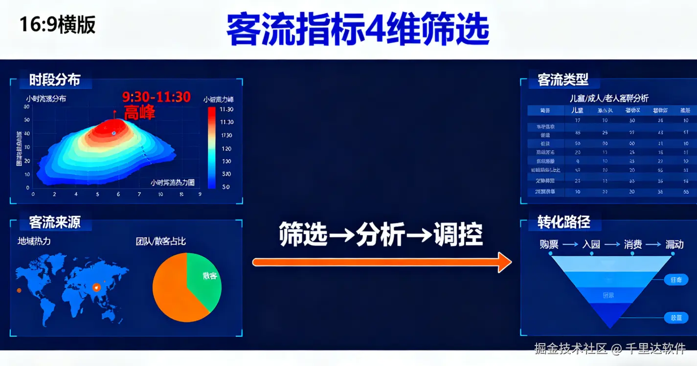 • 数据支撑:客群数据来自千里达景区票务系统的 “购票信息”(如儿童票需填写年龄、学生票需上传学生证)与闸机 “刷脸核验” 的年龄识别,确保数据准确。