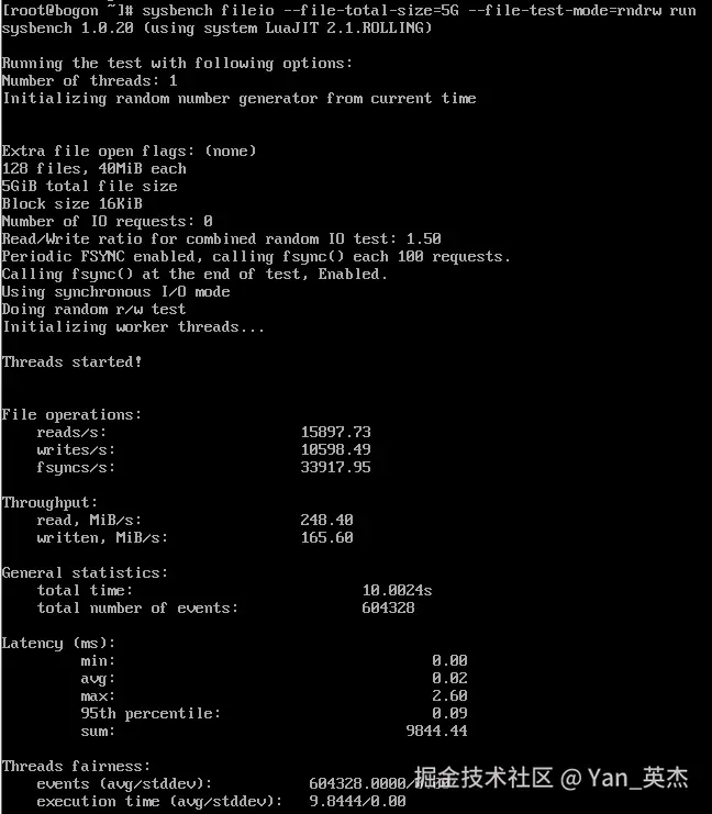 核心测试指令:sysbench fileio --file-total-size=5G --file-test-mode=rndrw run