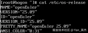 - 系统版本核查:执行cat /etc/os-release命令,盯"NAME"和"VERSION",确认是openEuler 25.09完整版,避免装成精简版