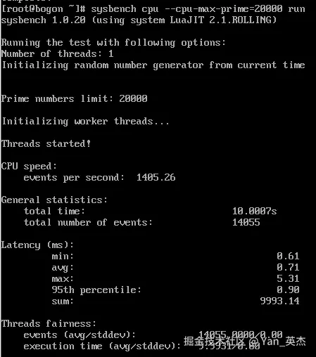 核心测试指令:sysbench cpu --cpu-max-prime=20000 run