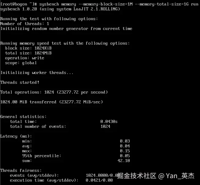 核心测试指令:sysbench memory --memory-block-size=1M --memory-total-size=1G run