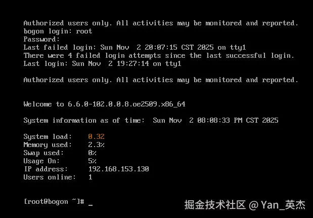- 性能基准数据:内核版本"6.6.0-102.0.0.8.oe2509.x86_64"带"oe2509"标识,证明是基于优化思路打造的企业级内核;系统负载0.32、内存使用率2.3%,说明环境纯净无干扰,测性能数据更准;IP地址192.168.153.130记好,后面安全测试要用它当目标靶标