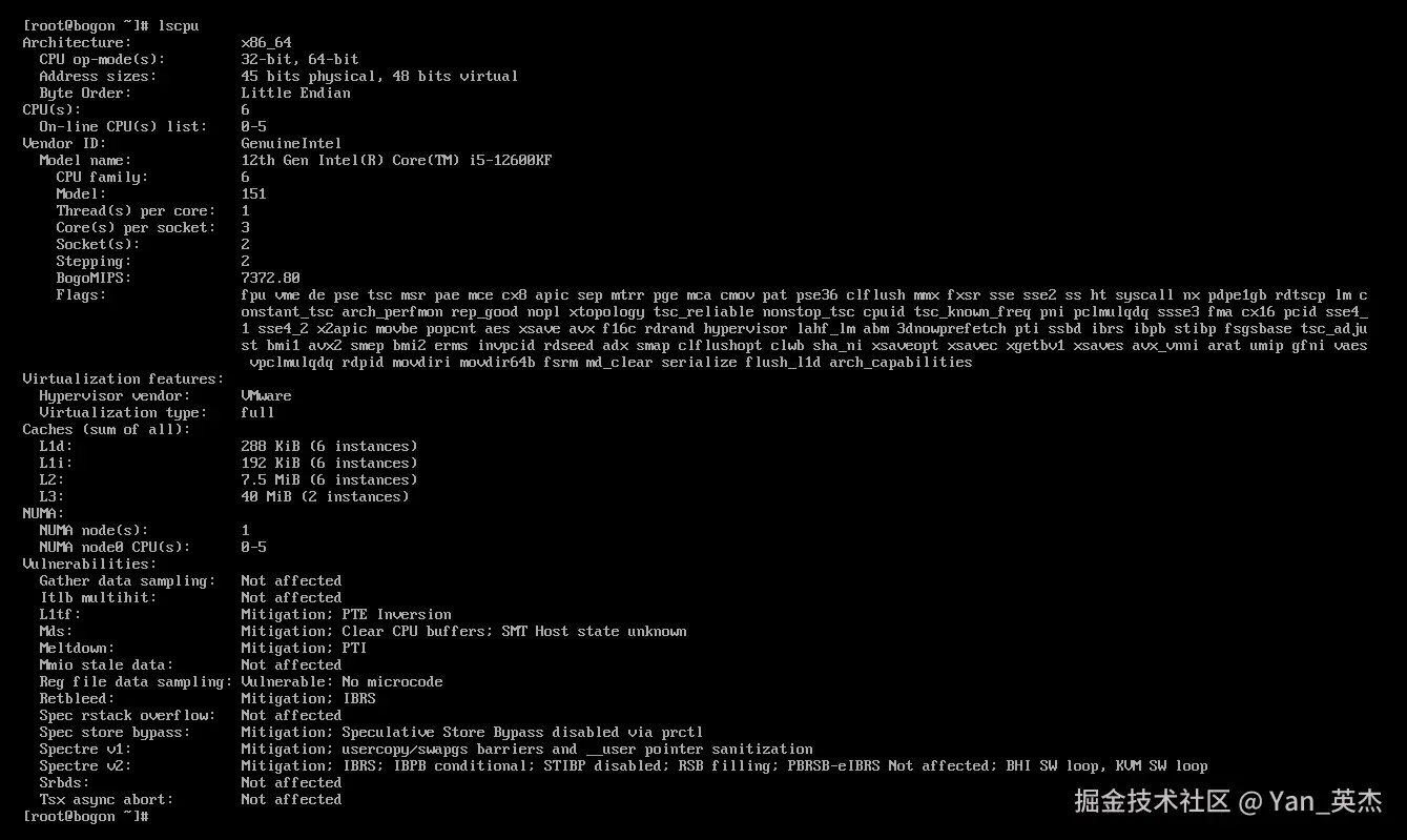 重点关注:“CPU(s)”(核心数)、“Architecture”(架构),确保和虚拟机配置一致。我实测显示6核x86_64架构,符合预设。
