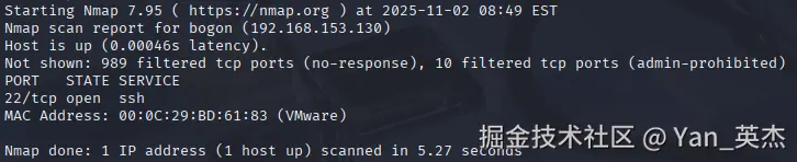 实测结果:nmap显示989个端口被过滤,仅22端口(SSH默认端口)开放。原生防火墙精准拦截未授权端口,攻击端无漏洞可乘,防御体系完全生效。
