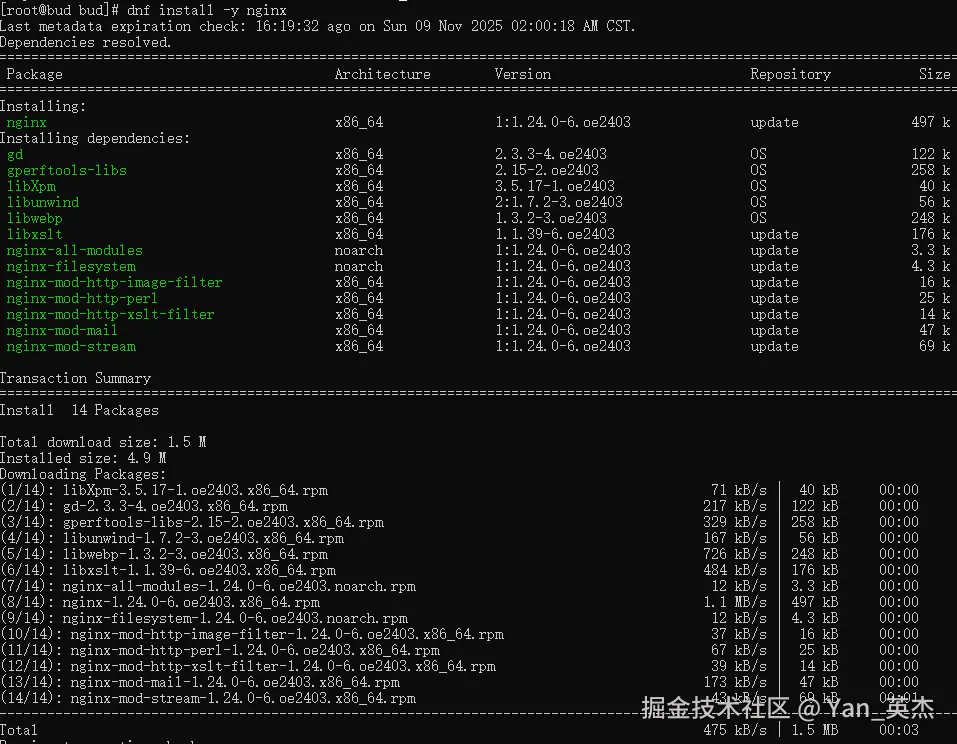 | Web服务器(nginx) | dnf install -y nginx | 1:1.24.0-6.oe2403(update仓库) | 约3秒 | 自动解析13个依赖包,下载1.5M,安装4.9M |