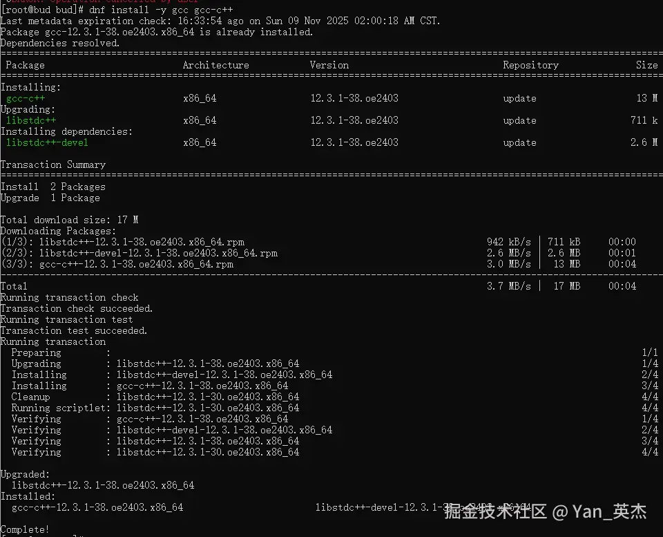 安装GCC工具链(核心命令) dnf install -y gcc gcc-c++ # 验证版本(实际输出) gcc --version # gcc (GCC) 12.3.1 (openEuler 12.3.1-38.oe2403) # 编译测试程序 g++ test.cpp -o test && ./test