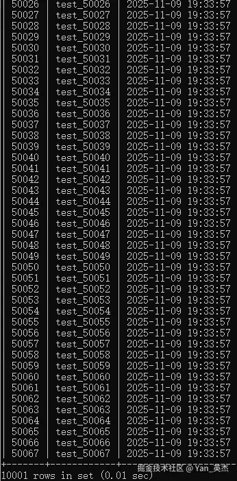 数据插入阶段因WSL2子系统IO性能限制+单条循环插入特性,耗时较长(实际执行5分9.42秒,Query OK, 1 row affected);复杂查询表现远超预期,关联查询返回10001条数据仅耗时0.01秒性能优化效果显著。 实测结论:openEuler 24.03搭载的MySQL 8.0.36